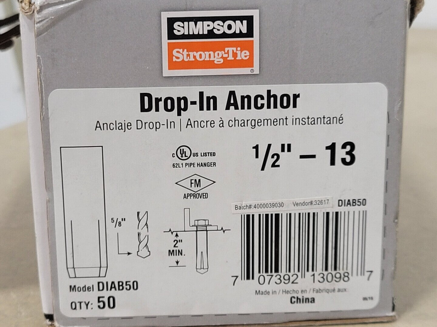 1/2" - 13" Drop-In Anchor DIAB50 (Box of 37 pcs)