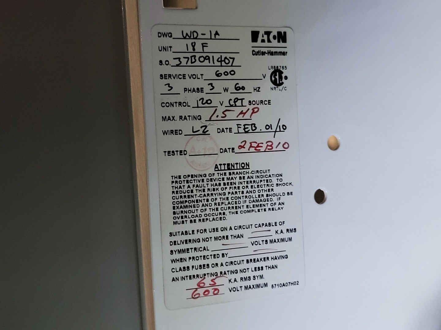 **Fits 2100 MCC Frame Circuit Breaker Maker: Eaton Model: HMCP Voltage: 600V Amps: 7 amps Poles: 3 Ground Fault Relay Maker: Eaton Model: D64RPB30 Overload relay: 24-240 Vac/dc Motor Saver Electronic Overload Relay Maker: Eaton Model: E777-575-LR Voltage: 450-600VAC Phase: 3 Transformer Maker: MCi Model: 5576-14-120-00 VA: 150VA Primary: 600V Secondary: 120V Devicenet Module Maker: Eaton Model: EC10-120-DN Inputs: 115VAC Contactor Maker: Eaton Model: CN15DN3 Amp: 27 Size: NEMA 1 |