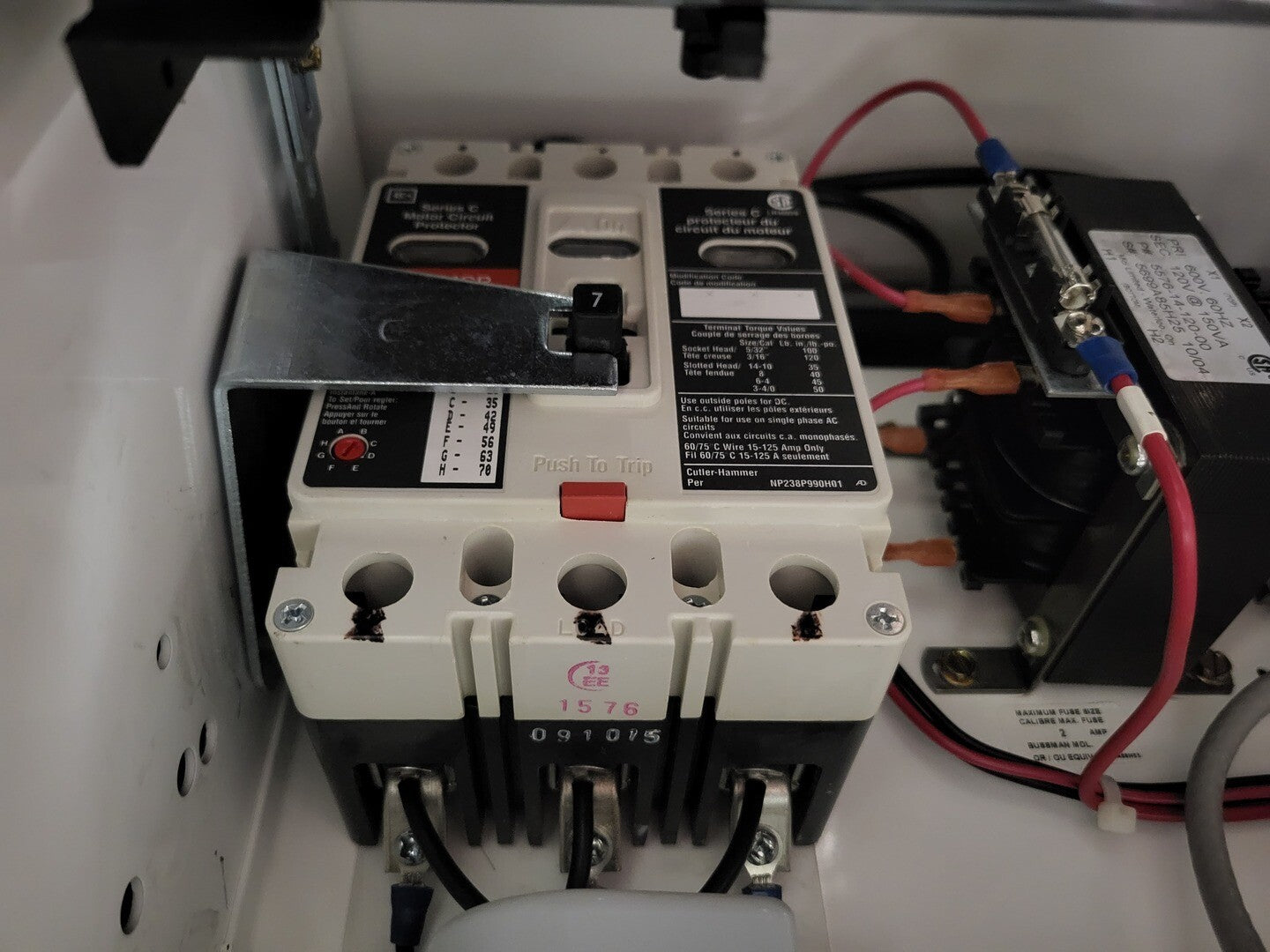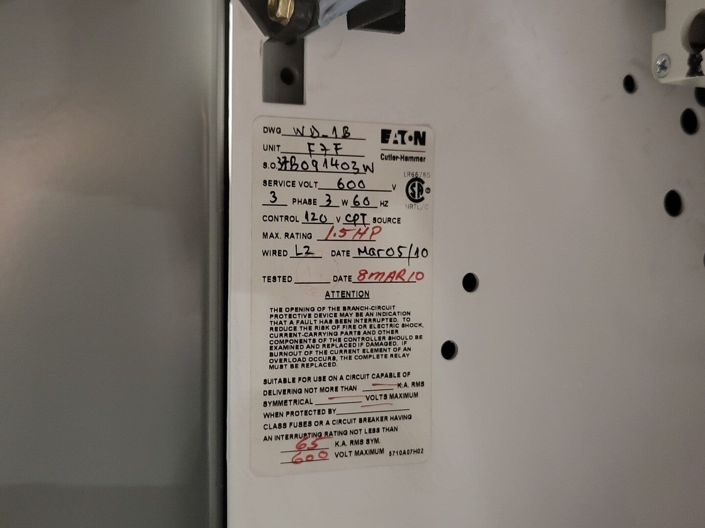 **Fits 2100 MCC Frame Circuit Breaker Maker: Eaton Model: HMCP Voltage: 600V Amps: 7 amps Poles: 3 Ground Fault Relay Maker: Eaton Model: D64RPB30 Overload relay: 24-240 Vac/dc Motor Saver Electronic Overload Relay Maker: Eaton Model: E777-575-LR Voltage: 450-600VAC Phase: 3 Transformer Maker: MCi Model: 5576-14-120-00 VA: 150VA Primary: 600V Secondary: 120V Devicenet Module Maker: Eaton Model: EC10-120-DN Inputs: 115VAC |