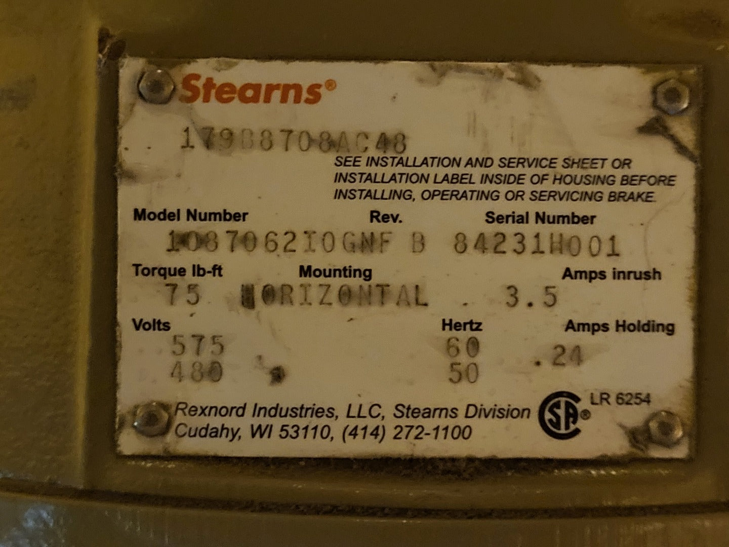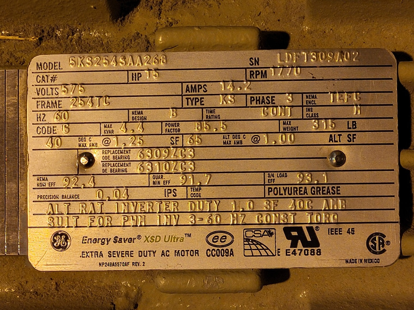 15 hp, 575 volts, 1770 rpm, 3-Ph, 254TC Electric Motor 5KS254SAA268