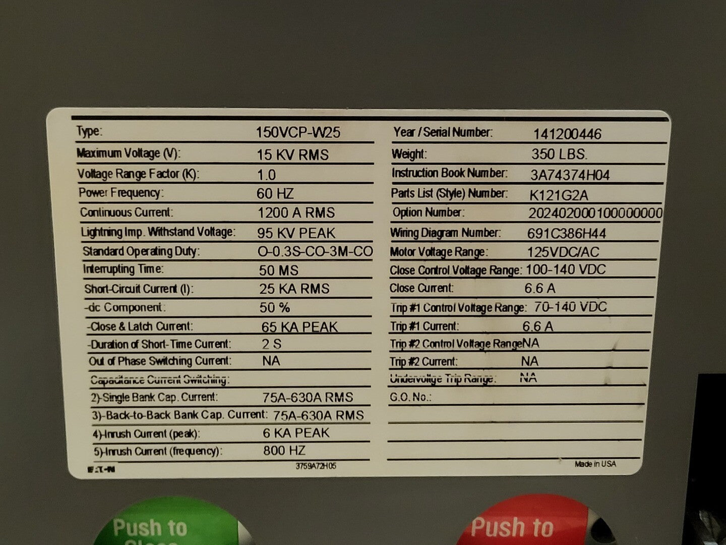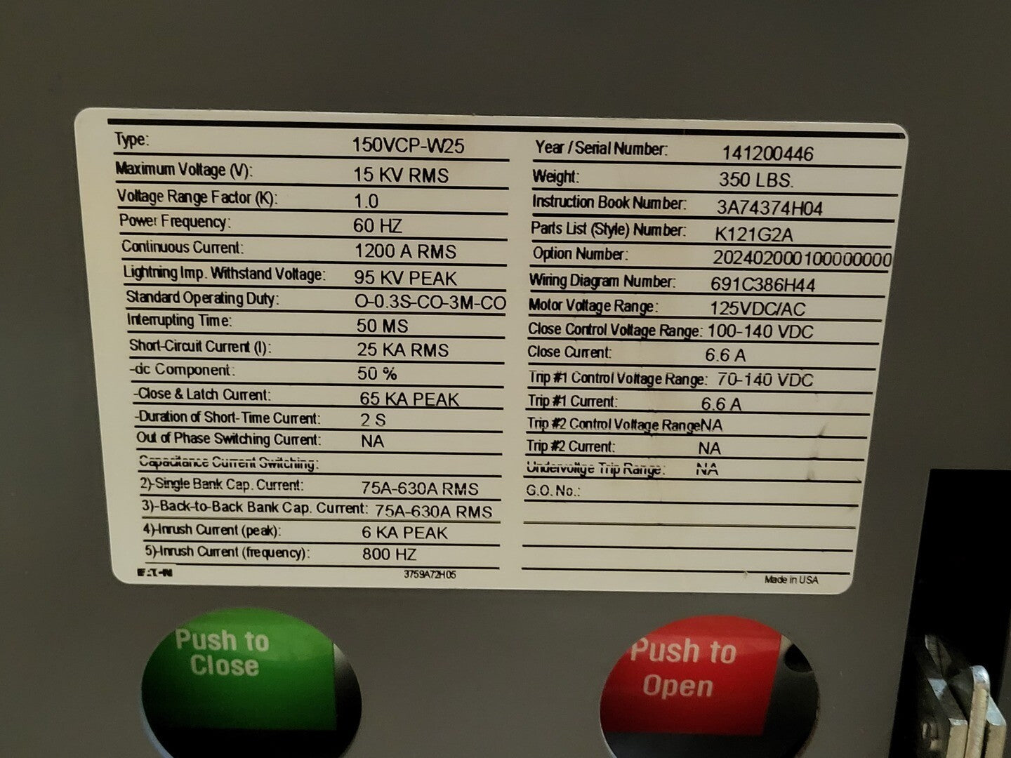 Max. Voltage: 15 kV RMS Lightning Imp. Withstand Voltage: 95 kV peak Standard Operating Duty: O-0.3S-CO-3M-CO Interrupting Time: 50 ms Short Circuit Current: 25 kA RMS Close & Latch Current: 65 kA peak Duration of Short-Time Current: 2 s Single Bank Cap. Current: 75A-630A RMS Back to Back Bank Cap. Current: 75A-630A RMS Inrush Current Peak: 6 kA Inrush Current Frequency: 800 Hz Motor Voltage Range: 125 VDC/AC Close Control Voltage Range: 100-140 VDC Close Current: 6.6 A Trip #1 Control Voltage Range: 70-140 VDC Trip #1 Current: 6.6 A Mount: Draw-out |