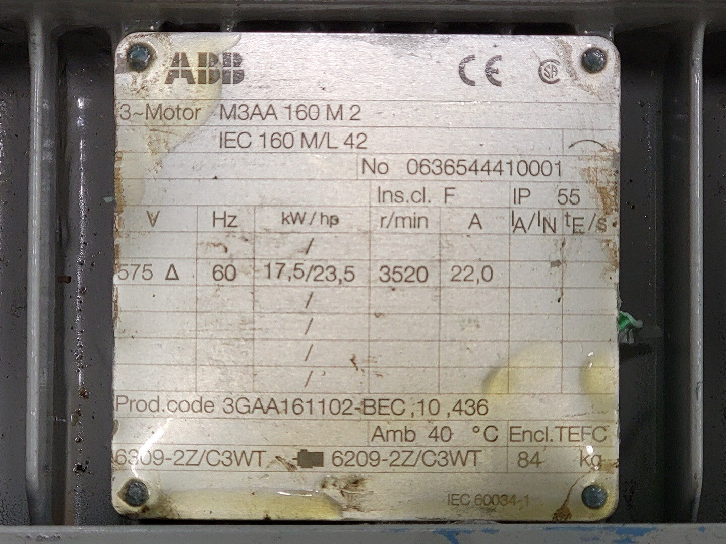 23,5 caballos de fuerza, 575 voltios, 3520 rpm, motor eléctrico 160 M3AA150M2