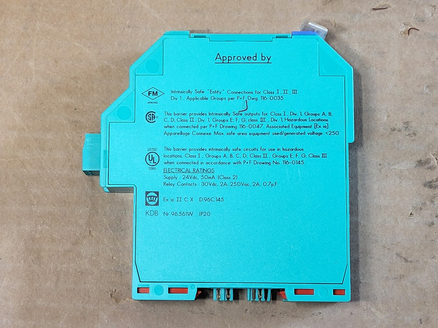 Operating Voltage Range: 20 to 30 VDC Current Consumption: 20 to 50 mA Number of Channels: 1 Relay Output Rating AC: 250 VAC, 2 A Relay Output Rating DC: 30 VDC, 2 A Intrinsic Safety Rating: Ex ia IIC Maximum Output Voltage Uo: 10.5 V Maximum Output Current Io: 13 mA Maximum Output Power Po: 34 mW Maximum External Capacitance Co: 2.4 uF Maximum External Inductance Lo: 210 mH Operating Temperature: Up to 60 C ambient |