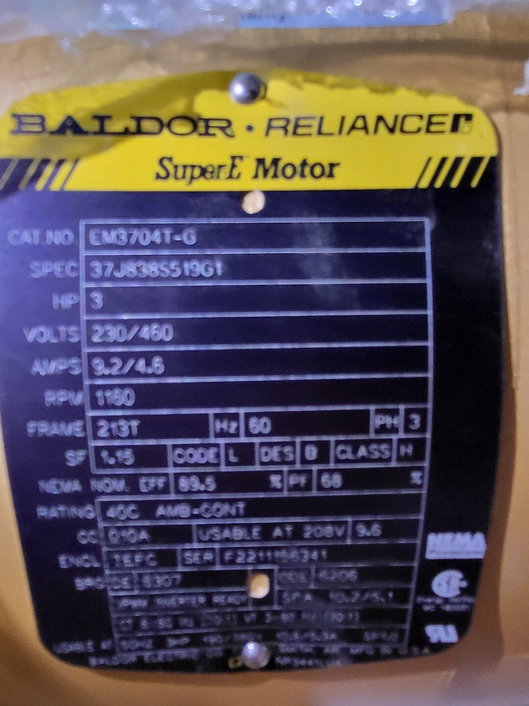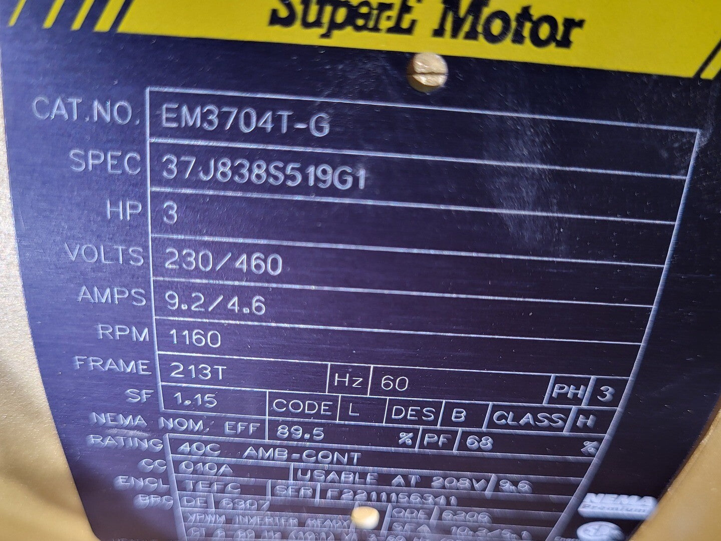 Amperage: 9.2/4.6 A Frequency: 60 Hz Phase: 3 Enclosure: TEFC (Totally Enclosed Fan Cooled) Service Factor (SF): 1.15 NEMA Efficiency: 89.5% Duty Rating: Continuous (AMB-CONT, 40°C) Insulation Class: B Design Code: B Weight: 135 lbs Mounting: Foot-mounted Usable at 208V: Yes (9.6 A) |