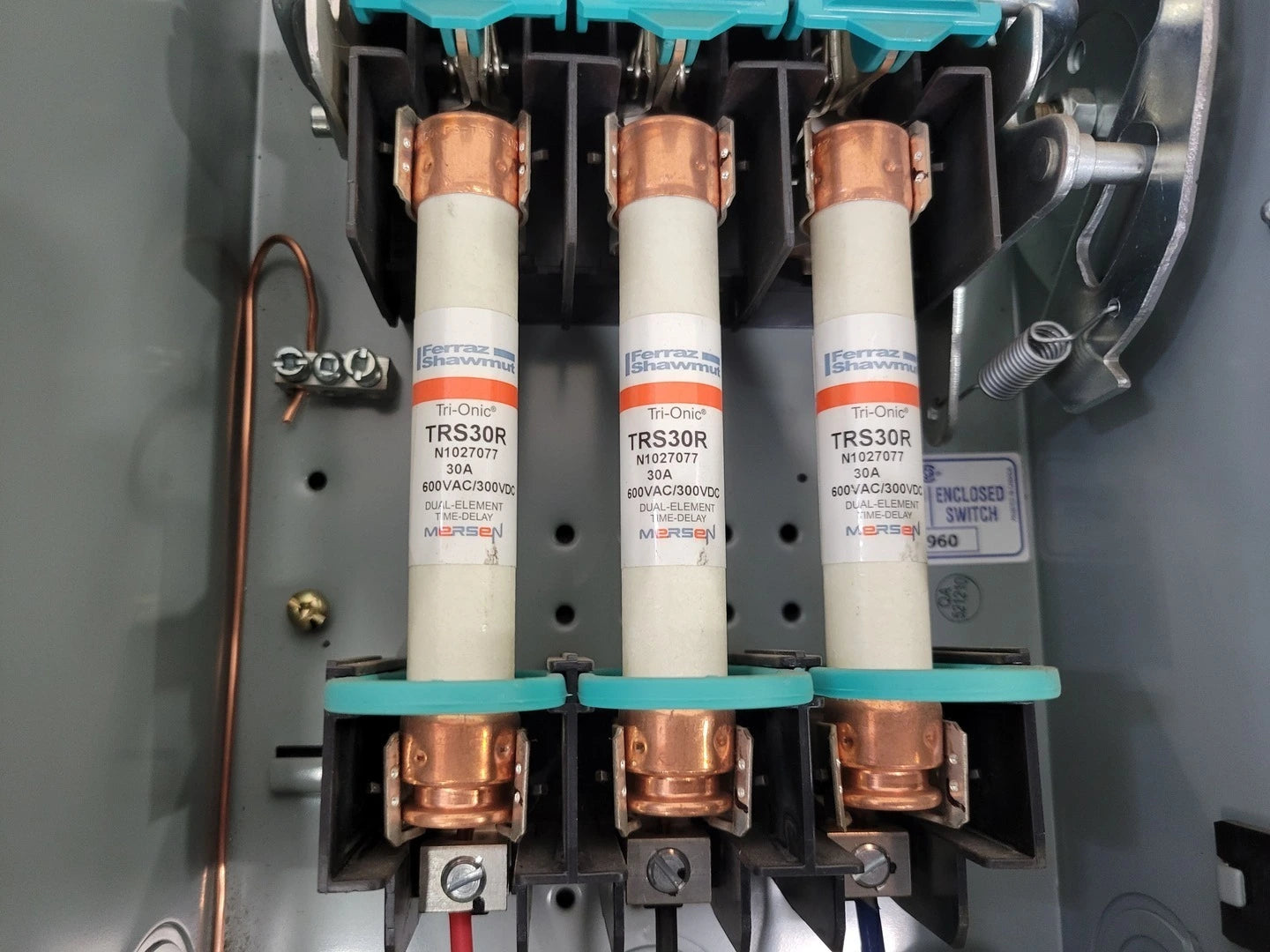 3 x MERSEN 30A, 600VAC/300VDC, fusibles de retardo de tiempo de elemento dual (SERIE: Tri-Onic, MODELO: TRS30R)