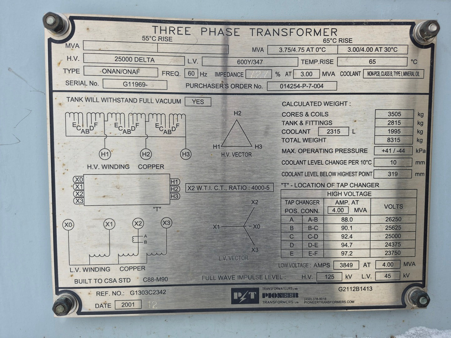Frequency: 60 Hz Cooling Class: ONAN / ONAF Connection: HV: Delta, LV: Wye Impedance: 7.27 % at 3.00 MVA Full wave impulse level: HV: 125 kV, LV: 45 kV Insulation Class: 65 °C rise Coolant: Non-PCB, Class B, Type I, Mineral Oil Tank will withstand full vacuum: yes |
