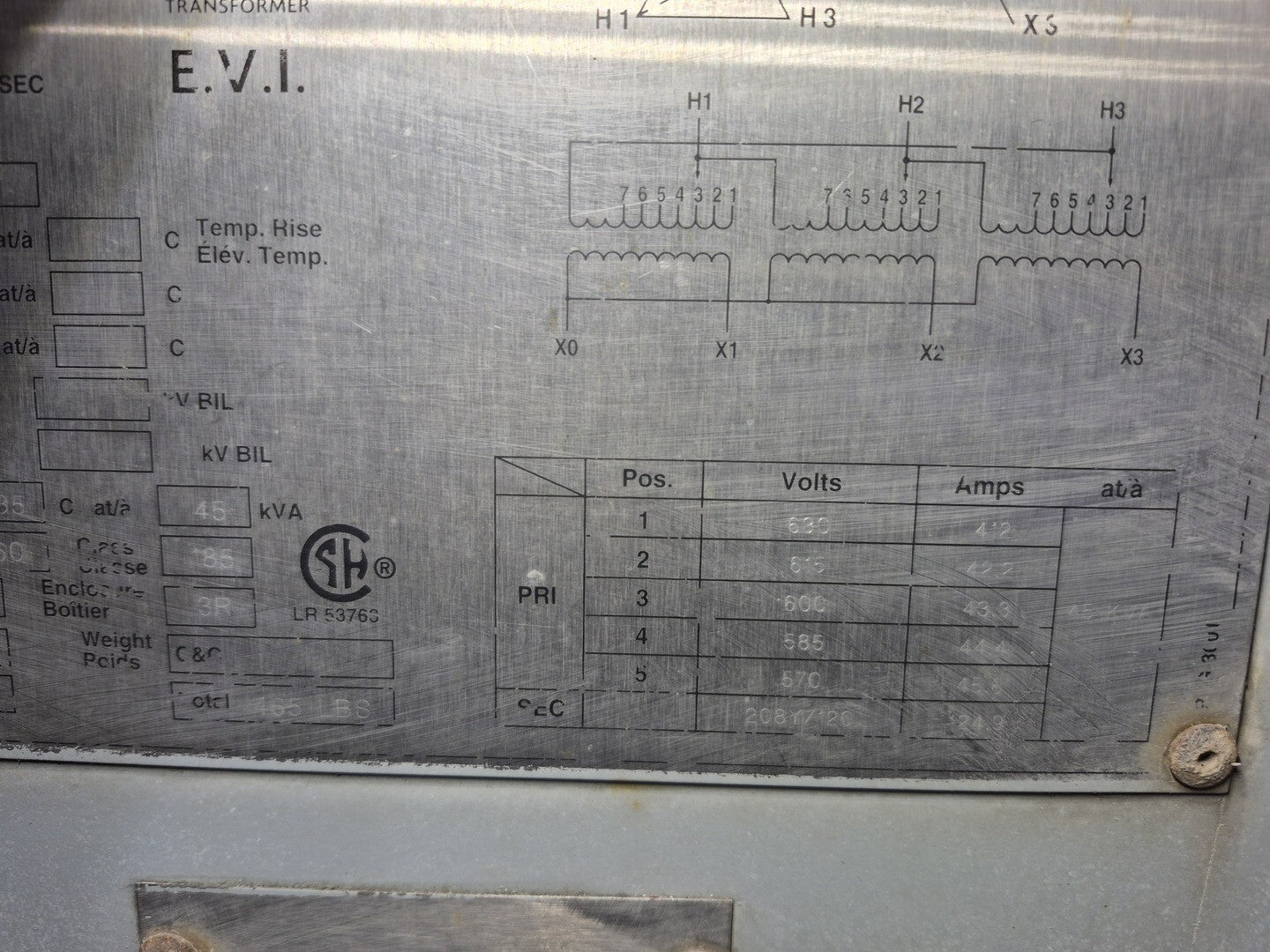 45 kVA Transformer 600 pri. volts, 208Y/120 sec. volts CETC0045S001532