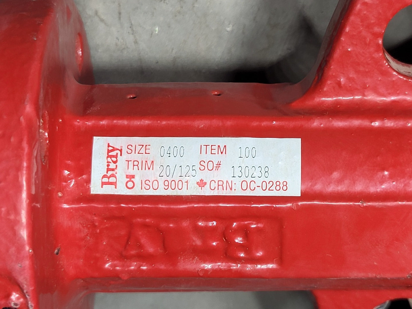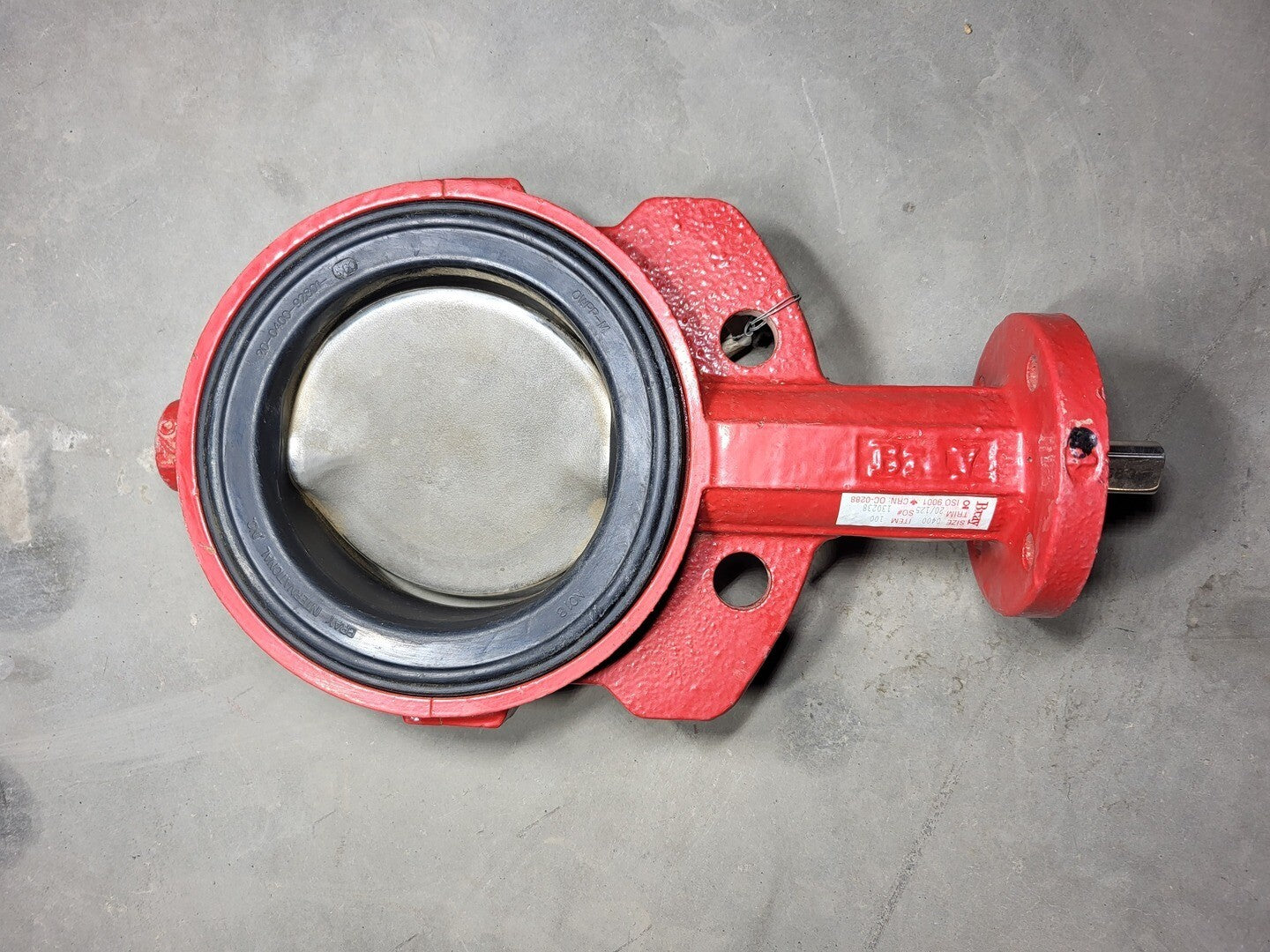 Size: 4 inch Trim: 20/125 Body Material: Cast iron (red epoxy coated) Disc Material: Stainless steel (visible in photo) Seat Material: Resilient rubber liner Connection Type: Lug style, flange mounted Operation: Gear, lever, or actuator (not included in photo) Typical Applications: Water distribution, HVAC, fire protection, industrial service |