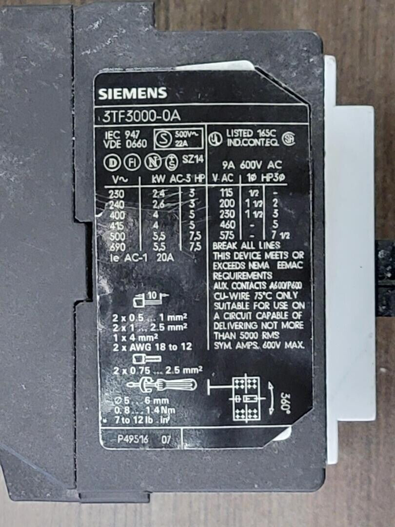 Contactor 3TF3000-0A de 7,5 hp, 20 amperios y 600 voltios