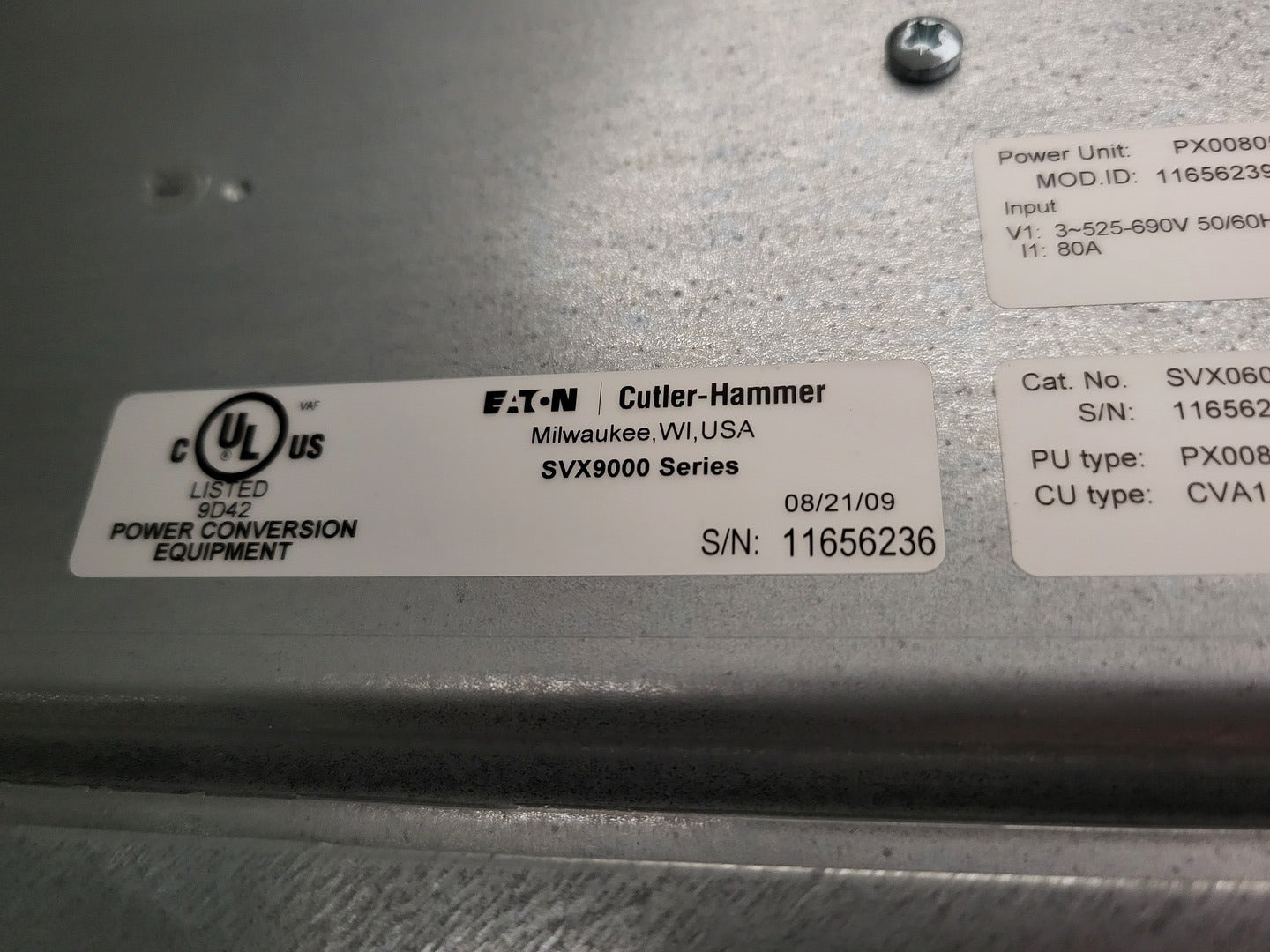 **Fits 2100 MCC Frame Input Rating: 3-ph, 525-690V, 50/60 Hz, 80A Output Rating: 3-ph, 0-690V, 0-320 Hz, 62/80A Power: 60CT/75VT VFD Model: SVX060A1-5A4N1 Breaker Make: Eaton Cutler Hammer Amperage: 150 amps Voltage: 600 volts Poles: 3 Trip Model: LFD3150R Control Relay x 2 Make: Eaton Model: XTRE10B22 Transformer Model: 5642-14-120-00 Primary volts: 600v Secondary volts: 120v Reactor Make: Rex Model: 80C5LF |