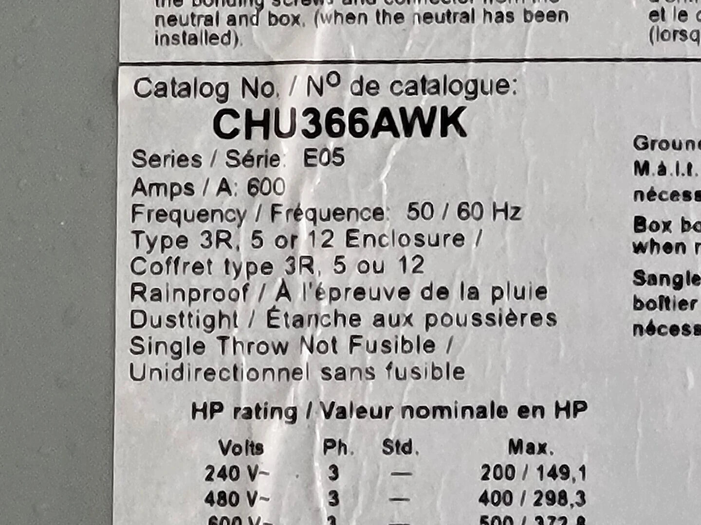 CHU366AWK Interruptor de seguridad de alta resistencia, 600 A, 600 V, de una vía, sin fusible
