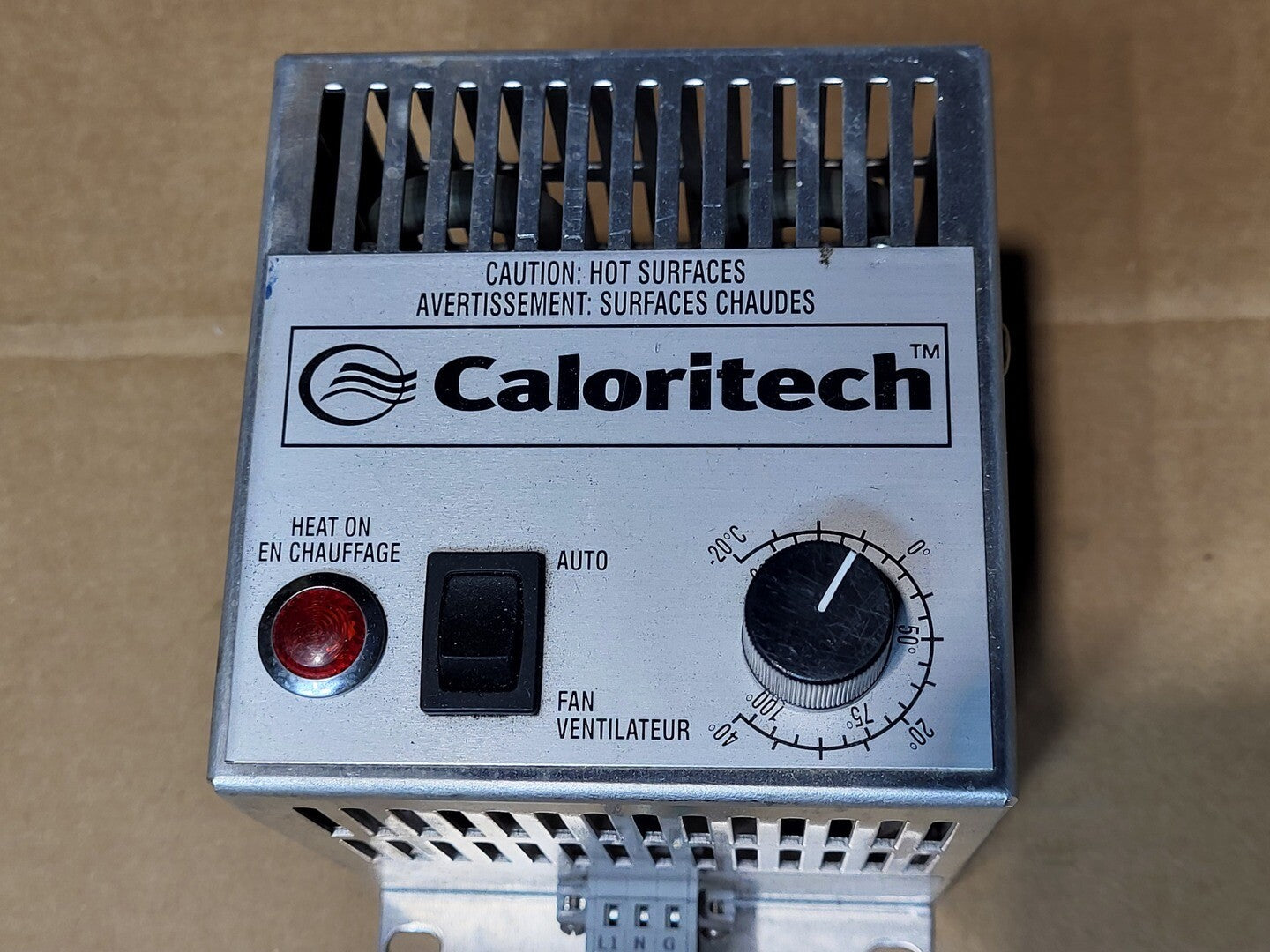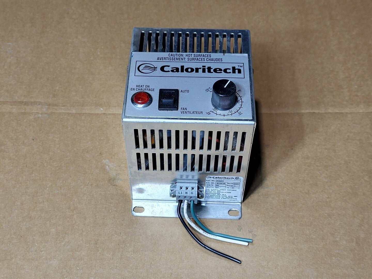 Voltage: 120 V AC Phase: Single Phase Power Rating: 125 Watts Frequency: 60 Hz Thermostat Control: Adjustable Mounting Type: Panel or Surface Mount Indicator Light: Heat On (Red) Switch: Auto/Fan Selector Temperature Range: Factory adjustable for enclosure heating applications Housing Material: Metal (vented design) Operating Environment: Indoor, Enclosure Heating |
