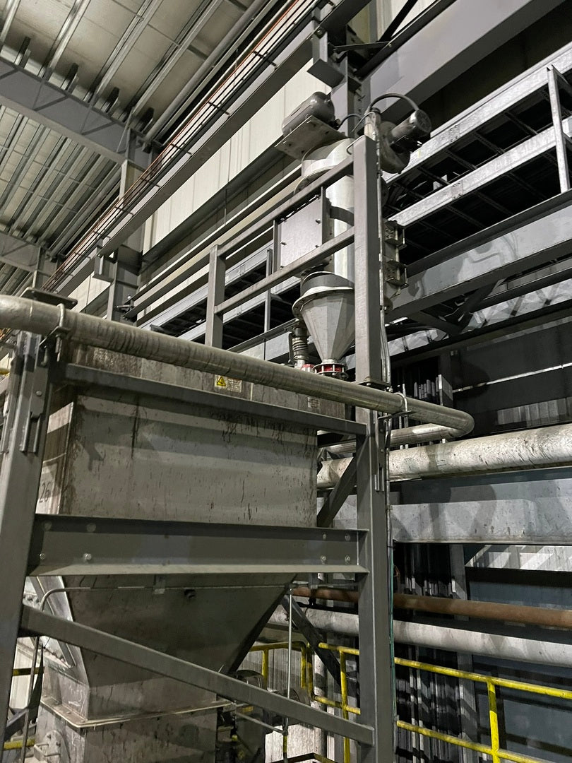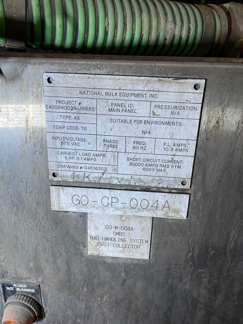 PDF ManualPDF Technical Dwgs & Assembly Parts ListPrevious Application: Was used for Sodium Metabisulphite processing Material: Stainless Steel Density: 1.48 SG, 92 PCF Bag Design: 1 ton bulk bag, flat bottom, 31 CF Hopper Total Air Volume: 58 CF Input voltage: 575 volts Phase: 3 FLA: 10.9 A Largest Load Amps: 5 hp, 6.1 A Short circuit current: 30 kA Control Enclosure Type: 4X Dust Collector Type: Reverse pulse jet Capacity: Rated to 300 CFM @ 6" w.c. Filter Cartridge: