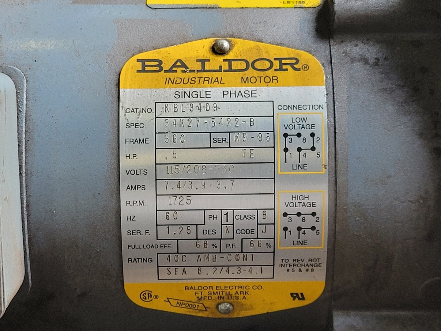 0.5 hp, 115/208-230 volts, 1725 rpm, 56C Electric Motor KBL3409