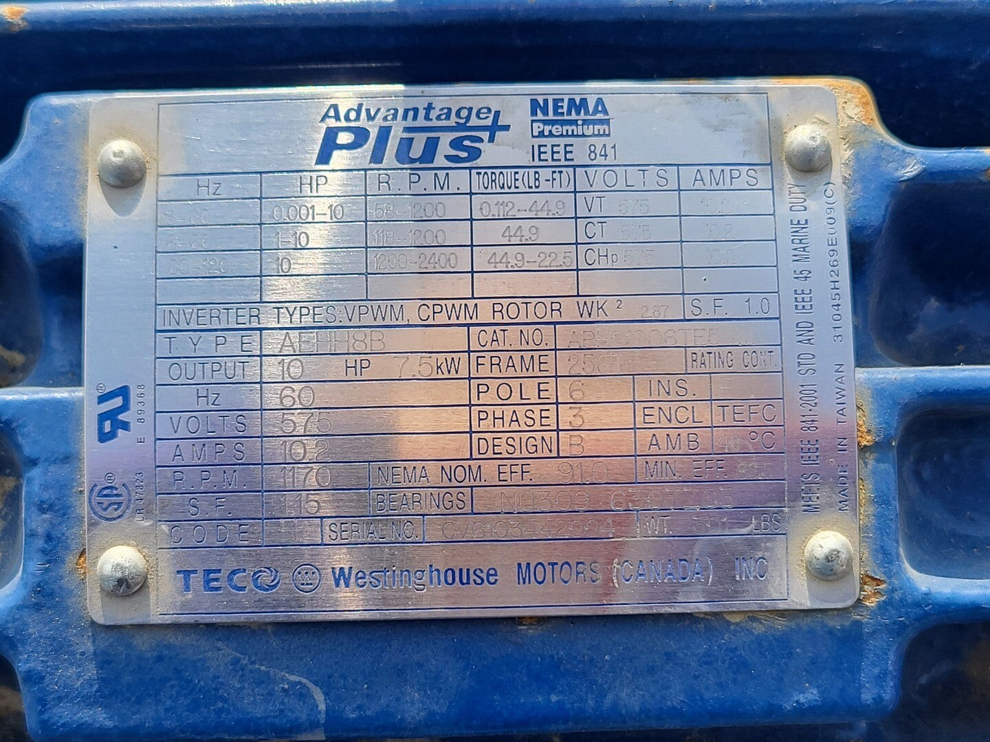 10 hp, 575 volts, 1170 rpm, 256T Electric Motor APH01006TE5-M