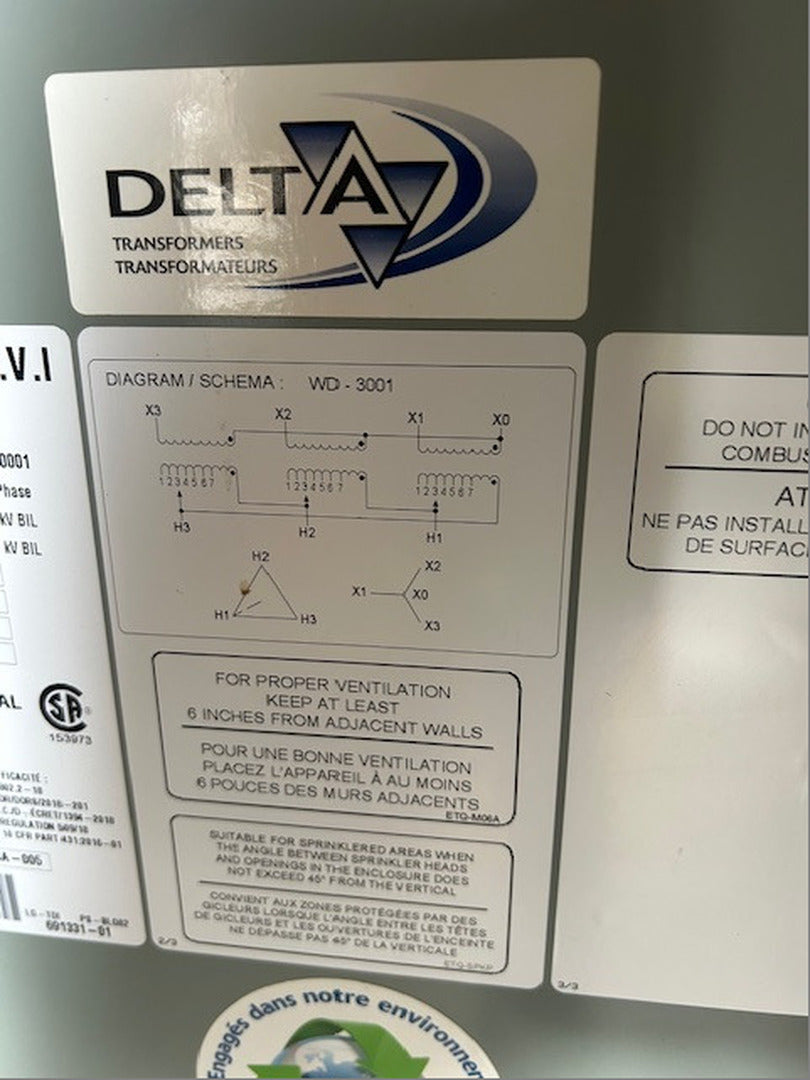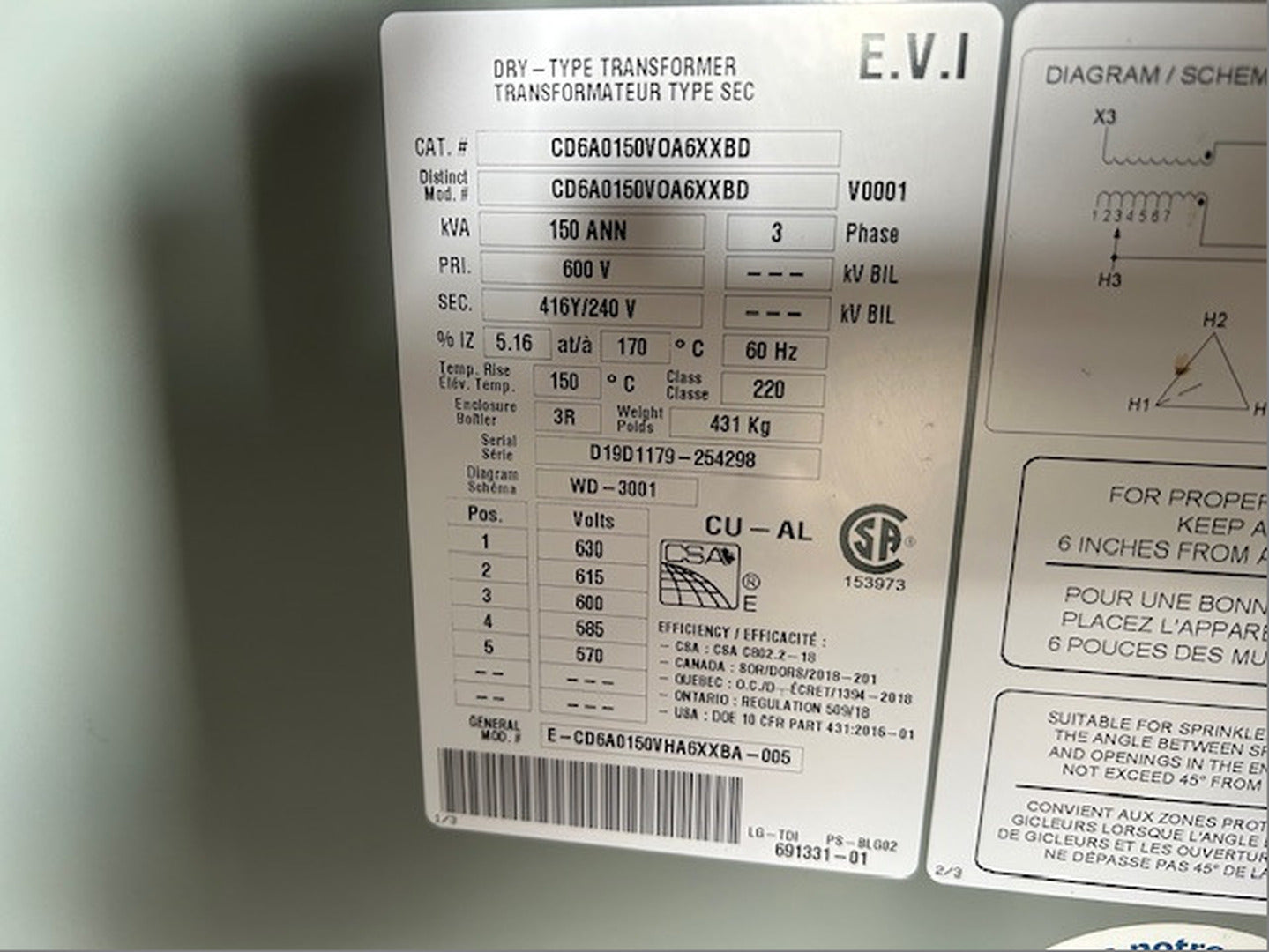 150 kVA Transformer, 600 Pri. Volts, 416/240 Sec. Volts CD6A0150VOA6XXBD