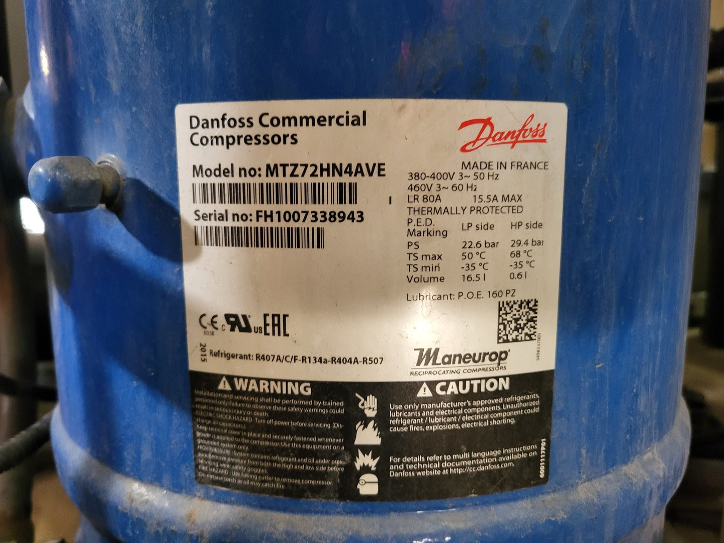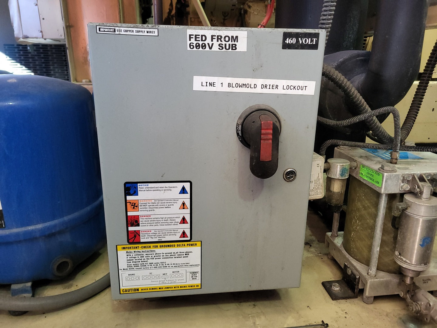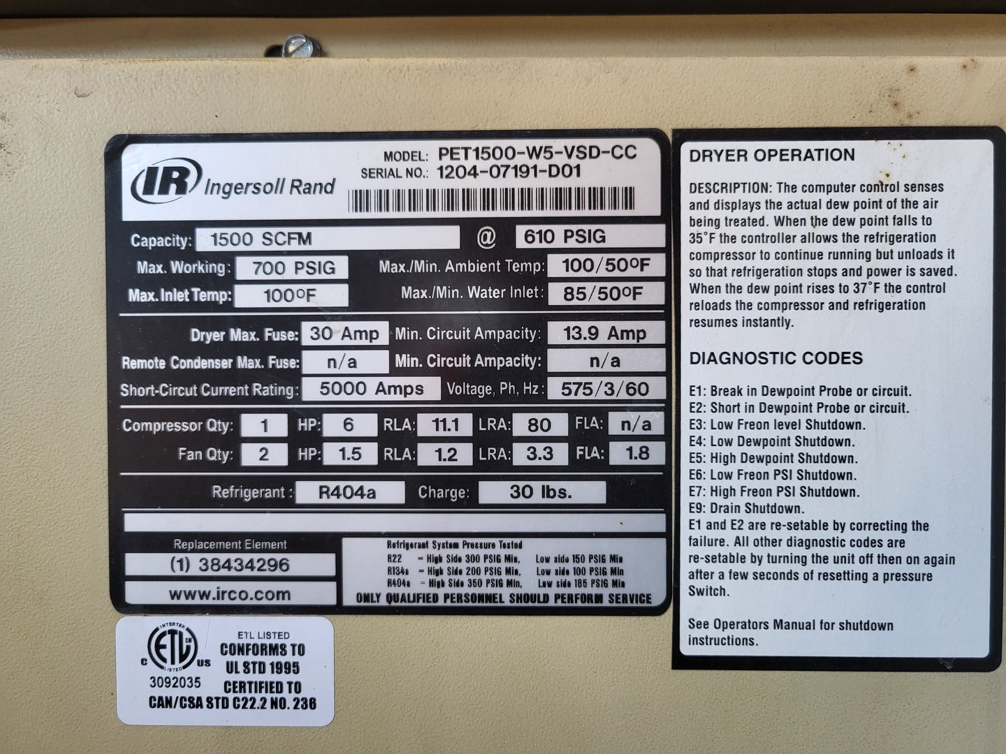 Capacity: 1500SCFM @ 600psi Max Working Pressure: 700psi Max Inlet Temp: 100F Dryer Max Fuse: 30 Amp Min Circuit Ampacity: 13.9 Amp Voltage, Ph, Hz: 575V, 3-Ph, 60Hz Short Circuit Current Rating: 5000 Amps Refrigerant: R404A Components: 2x Transformer: ACME transformer, 1.5 kVA, 240/480V Pri, 120/240V Sec, T 2-53011-S Compressor: Danfoss, MTZ72HN4AVE Control Transformer: HPS, 350VA, 1Ph, PT350MQMJ-3 Inverter Drives: Danfoss VLT2800 |