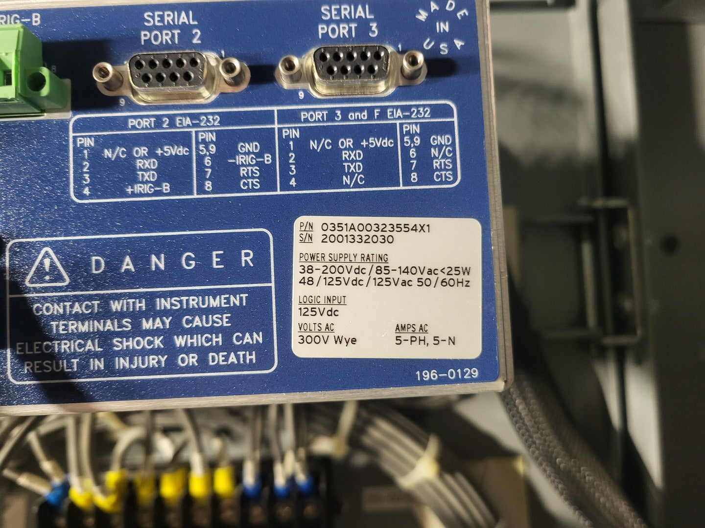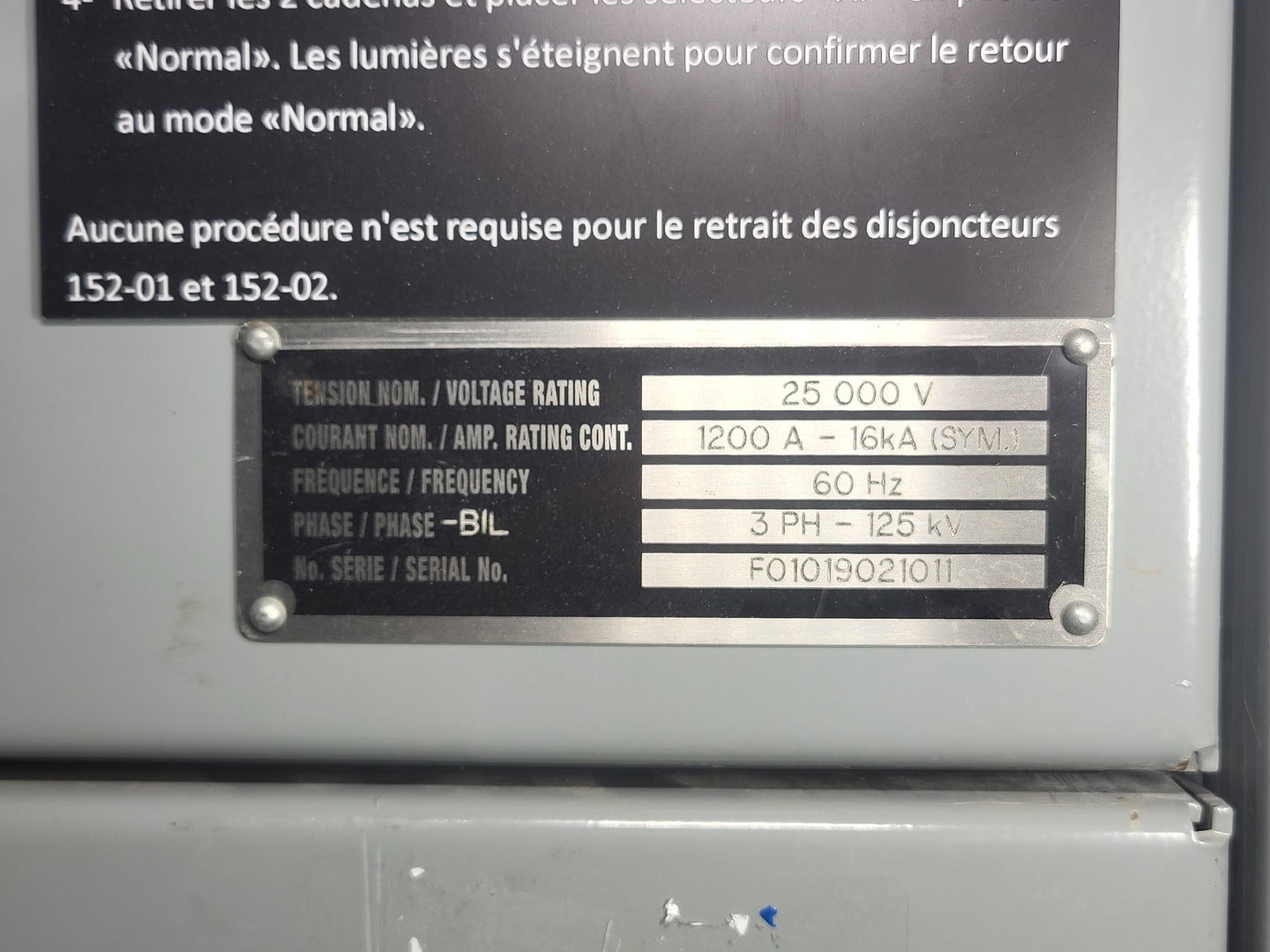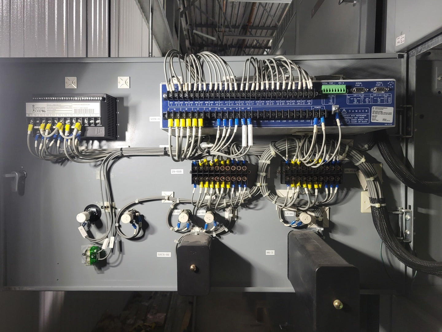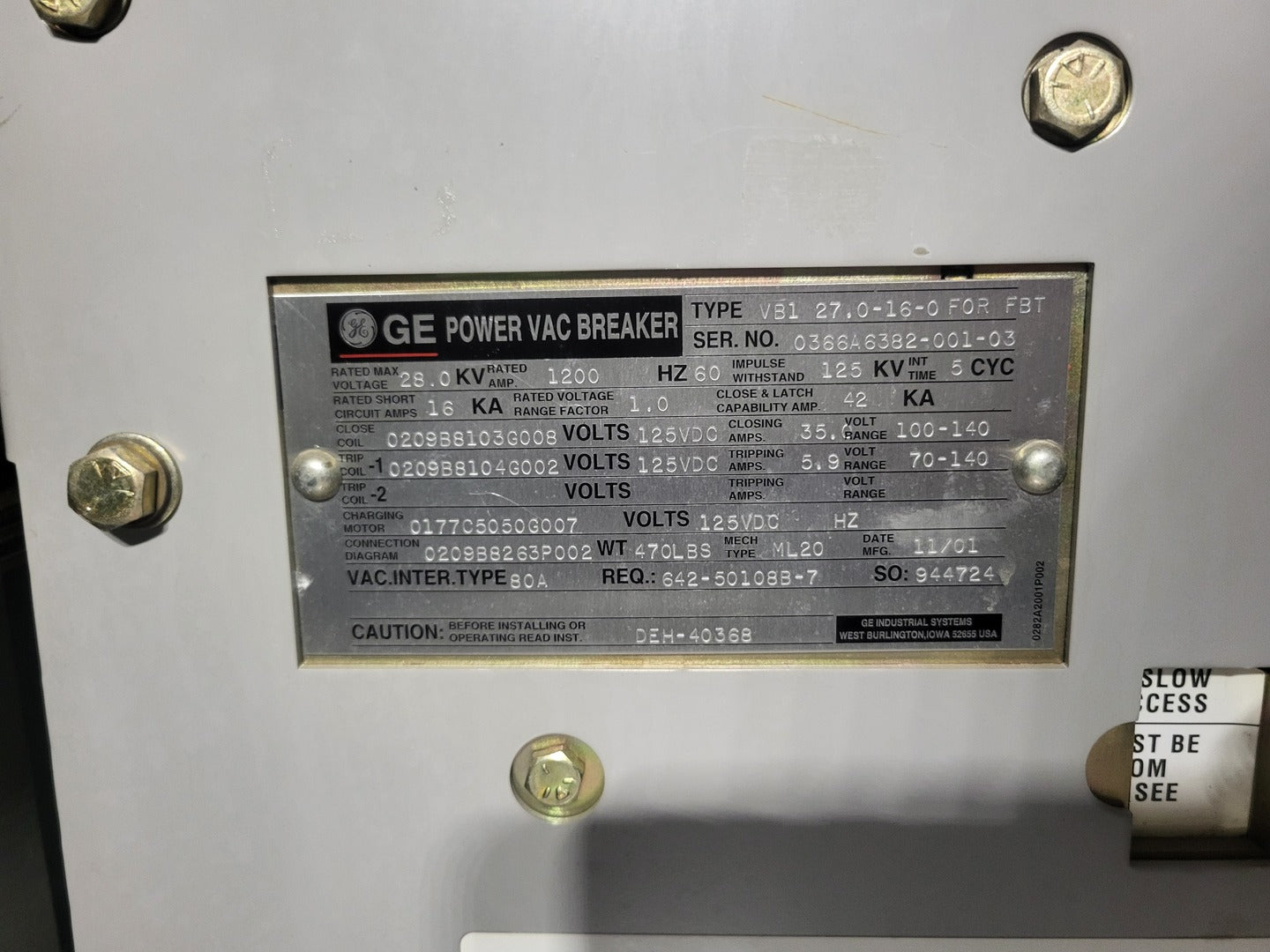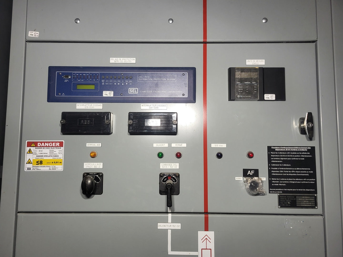 Voltage Rating: 25000 V Amp Rating Cont: 1200 A Short Circuit Rating: 16 kA symmetrical Phase: 3 ph BIL: 125 kV Power Vac Breaker VB1 27.0-16-0 Rated Max Voltage: 28 kV Rated Amp: 1200 A Frequency: 60 Hz Impulse Withstand: 125 kV Int Time: 5 CYC Rated Short Circuit Amp: 16 kA Rated Voltage Range Factor: 1.0 Close & Latch Capability Amp: 42 kA Distribution Protection Relay SEL-351A Mounting: Panel mount Ports: Three EIA-232 ports, an EIA-485 port Outputs: 8 (1 Alarm) Inputs: 6 Power Supply Rating: 38-200 VDC / 85 - 140 VAC, < 25 Watts Logic Input: 125 VDC Current Input: 5 A phase, 5 A neutral Power Quality Meter PQM-T20-C-A Control Power: 90 - 300 VDC, 20 VA // 70 - 265 VAC, 20 VA Additional (2) ABB Test Switches |