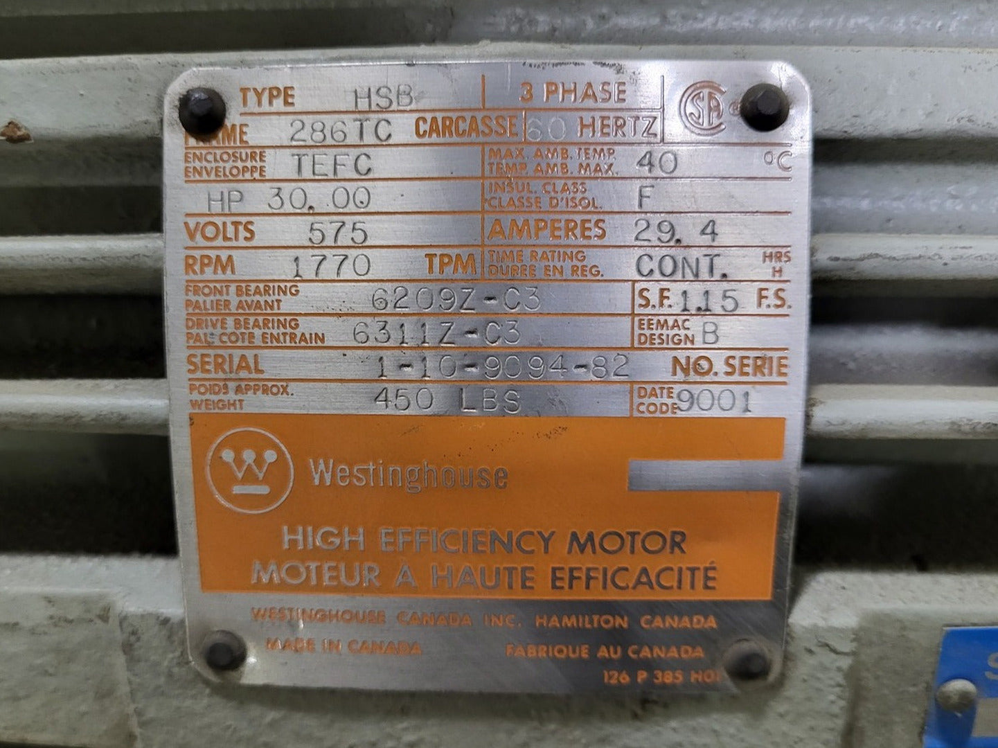 30 hp, 575 volts, 1770 rpm, 286TC Electric Motor HSB