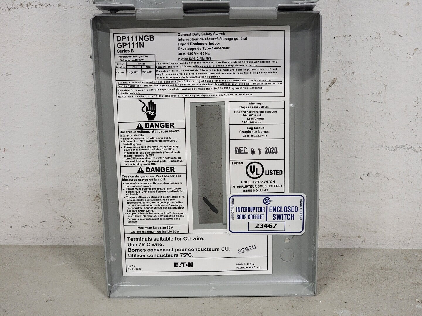 Type: General duty, plug fused Amperage Rating: 30A Enclosure: NEMA 1 Enclosure Material: Painted steel Fuse Class Provision: Plug fuses Fuse Configuration: Fusible with neutral Number Of Poles: Single-pole Number Of Wires: Two-wire Product Category: General duty safety switch Voltage Rating: 120V |