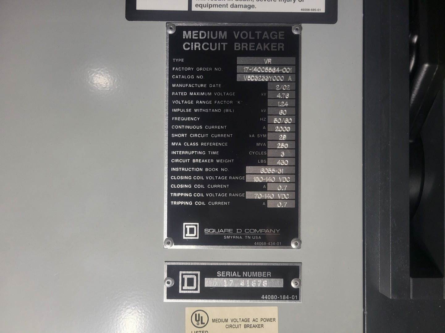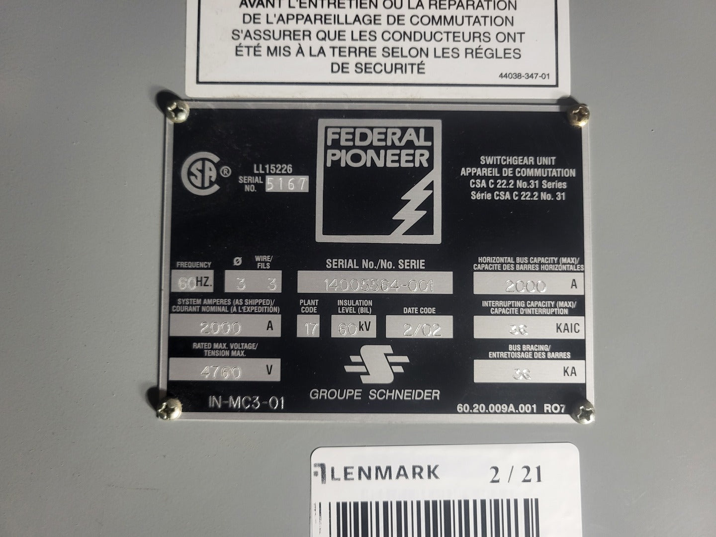 General Manufacturer: Federal Pioneer (Groupe Schneider) Equipment Type: Medium Voltage Metal-Clad Switchgear Installation Type: Indoor Phase: 3 Phase Frequency: 60 Hz Year: 2002 Electrical Ratings Rated Maximum Voltage: 4,760 V (4.16 kV Class) Continuous Bus Rating: 2000 A Interrupting Capacity: 36 kAIC Bus Bracing: 36 kA Insulation Level (BIL): 60 kV System Amps (Nominal): 2000 A Circuit Breaker Manufacturer: Square D / Schneider Type: Vacuum Drawout Circuit Breaker Rated Voltage: 4.76 kV Continuous Current: 2000 A Short Circuit Current: 29 kA Symmetrical MVA Class: 250 MVA Closing Coil Voltage: 100-140 VDC Tripping Coil Voltage: 70-140 VDC Protection & Controls Protection Relay: SEL (Schweitzer Engineering Laboratories) Metering: Schneider PowerLogic Voltage Transformer: Drawout Type Compartment Certifications Standard: CSA C22.2 No.31 Serial Number: 14005564-001 |
