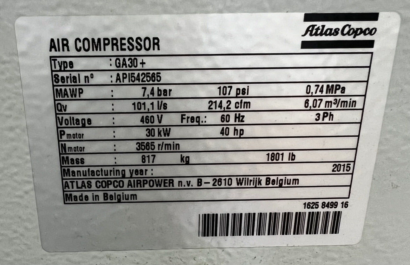 40 hp, 214.2 cfm, 107 psi Air Compressor GA30+