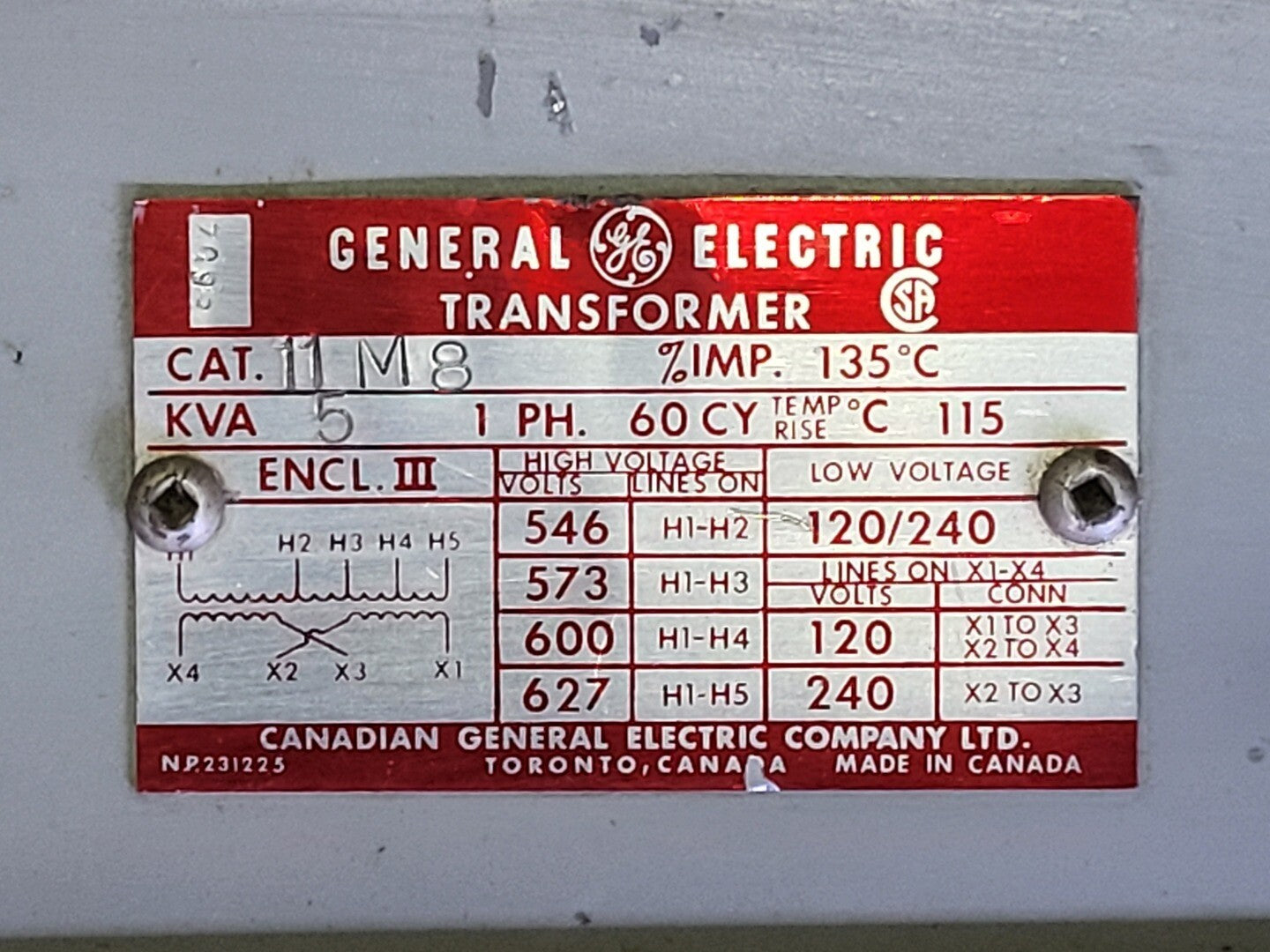 5kVA Transformer 600 Pri. Volts, 120/240 Sec. Volts, 11M8