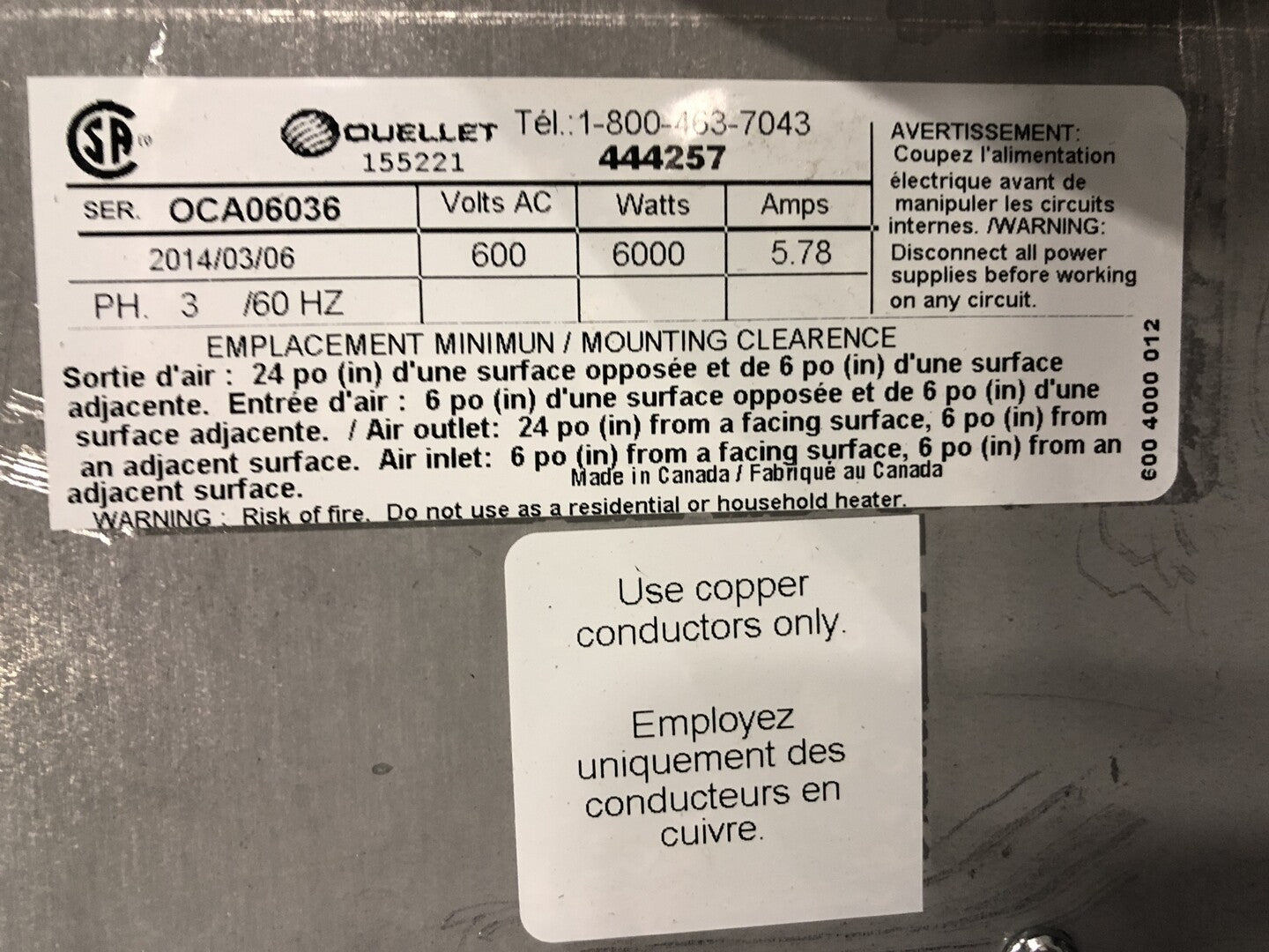 6000 Watt Cabinet Unit Heater No. OCA06036