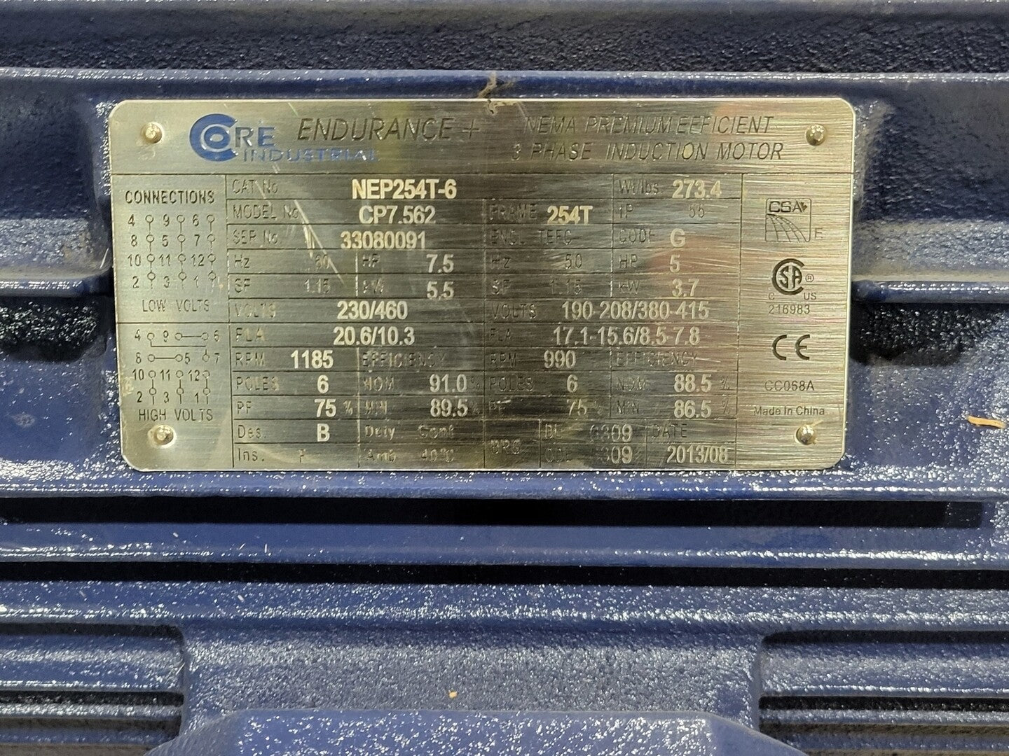 7.5 hp, 230/460 volts, 1185 rpm, 254T Electric Motor