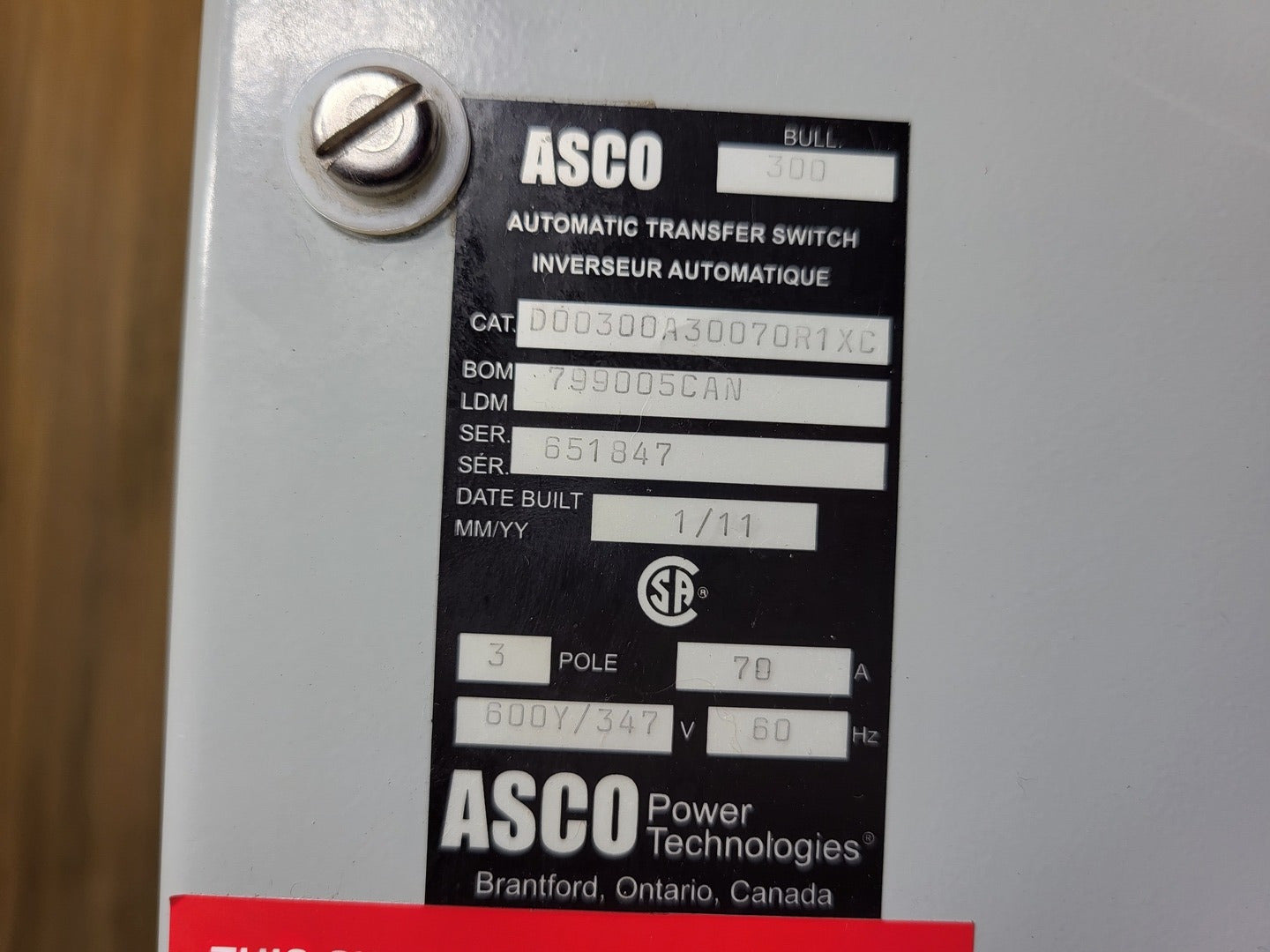 70 Amp Automatic Transfer Switch D00300A30070R1XC, 600Y/347V, 3-pole