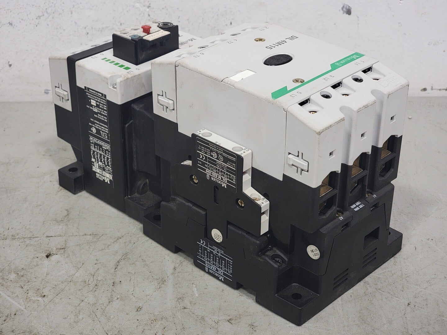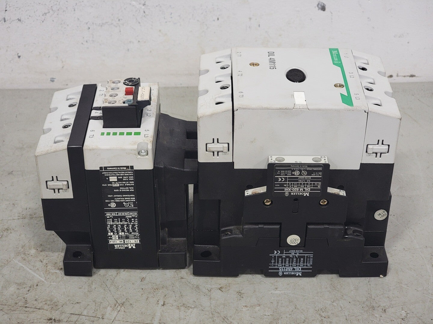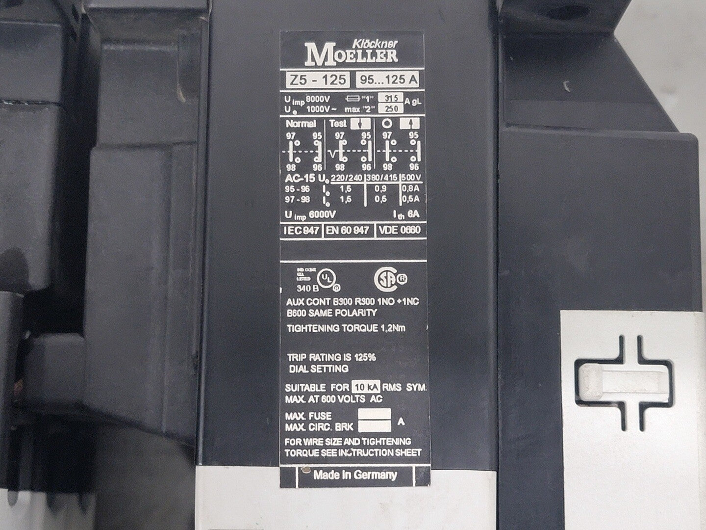 Poles: 3 Phase: 3 Mounting: Din Rail, Panel Terminal: Screw Coil Voltage: 110/120 VAC, 50/60 Hz 3-Phase hp Ratings: 200 VAC @ 40 hp, 230 VAC @ 50 hp, 460 VAC @ 100 hp Auxiliary Contact:- Model: DILM 820-XHI Contact Configuration: 1 NO, 1 NC Amps: 10 A VAC: 600 V VDC: 250 V Overload Relay:- Model: Z5-125 Amp Range: 95-125 A Volts: 600 VAC |