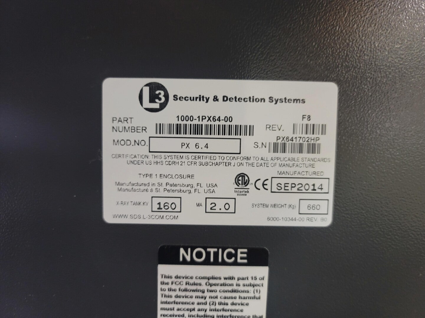 Tunnel Opening: 640 mm (25.2") W x 430 mm (16.9") H Conveyor Height: 762 to 812 mm (30" to 32") Power Requirement: 100-240 VAC, 1-Ph, -/+ 10% 50/60 Hz, +/- 1%, 1.0 kVA max Conveyor Speed: 0.22 m per second +2/-8% @ 50 Hz, 0.26 m per second +2/-8% @ 60 Hz Conveyor Capacity: 100 kg (220 lb) Scan Rate: >750 bags/hour (continuous mode) X-Ray:- Voltage: 150 kVp/160 kVp optional Duty Cycle: 100% Cooling: Sealed Oil Bath Beam Orientation: Vertically Upward Detector Configuration: 1152 photodiodes in L-shaped folded array configuration Imaging and Performance:- Resolution: 41 AWG standard, 44 AWG typical Penetration: 36 mm of steel standard, 38 mm typical Contrast Sensitivity: 4096 gray level stored Display Monitor: 19" high-resolution LCD Optional High-Powered X-Ray Imaging & Performance:- Resolution: 42 AWG standard, 45 AWG typical Penetration: 38 mm of steel standard, 42 mm typical Environmental:- Operating Temperature: 0 deg. C to 40 deg. C (32 deg. F to 104 deg. F) Storage Temperature: -20 deg. C to 50 deg. C (-4 deg. F to 122 deg. F) Humidity: 95% non-condensing Airborne Noise Level: <70dB(A) Accession Number 0612321-000 |