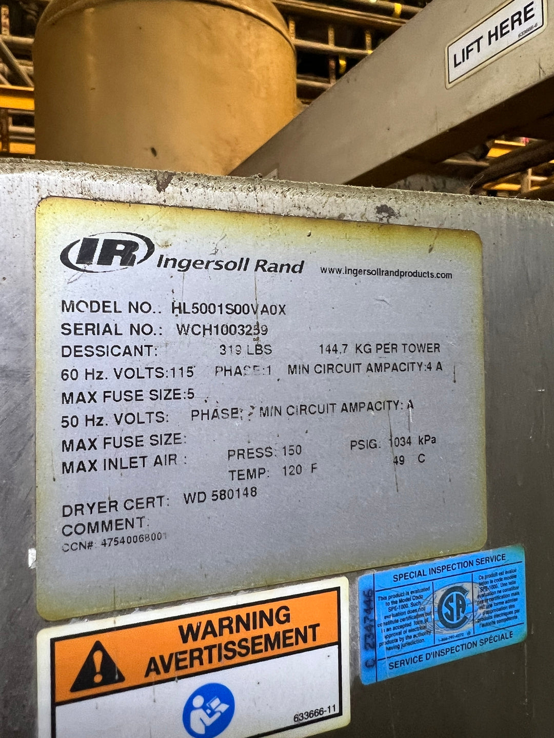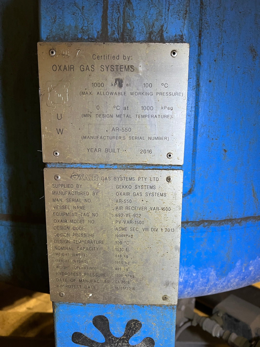 Desiccant Dryer Capacity: 500 SCFM Desiccant: 319 lbs (144.7 kg) Per Tower Electrical: 115 V, 1- ph, 60 Hz Min. Circuit Ampacity: 4 A Max. Inlet Air Pressure: 150 psig (1034 kPa) Max. Inlet Air Temp.: 120 F (49 C) Oxair Receiver Tank Oxair Model No.: PV-VAR-1500 Design Code: ASME SEC. VIII DIV. 1 2013 Nominal Capacity: 1510 L Design Pressure: 1000 kPag Design Temp.: 100 deg C Min. Design Metal Temp.: 0 deg C at 1000 kPag Weight (Empty): 446 kg Weight (Hydro): 1956 kg Weight (Operating): 465 kg Hydrotest Pressure: 1300 kPag |