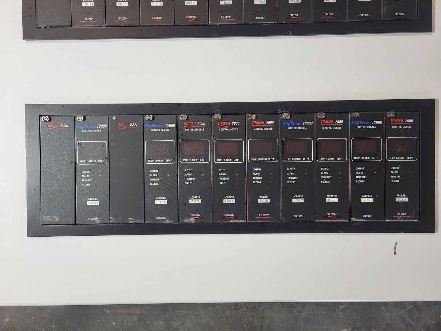 Heat trace controller panel with 29 control modules and 1 alarm/communications. CM 2000+ Module Specifications Operating Ambient: -40F to 149F Control Output: 12 VDC nominal, 50 mA max. Sensor Inputs: Two 3-wire 100 ohm platinum RTDs Power Requirements: 120 to 240 VAC nominal, 1-Phase, 5 W max. Temperature Measurement Range: