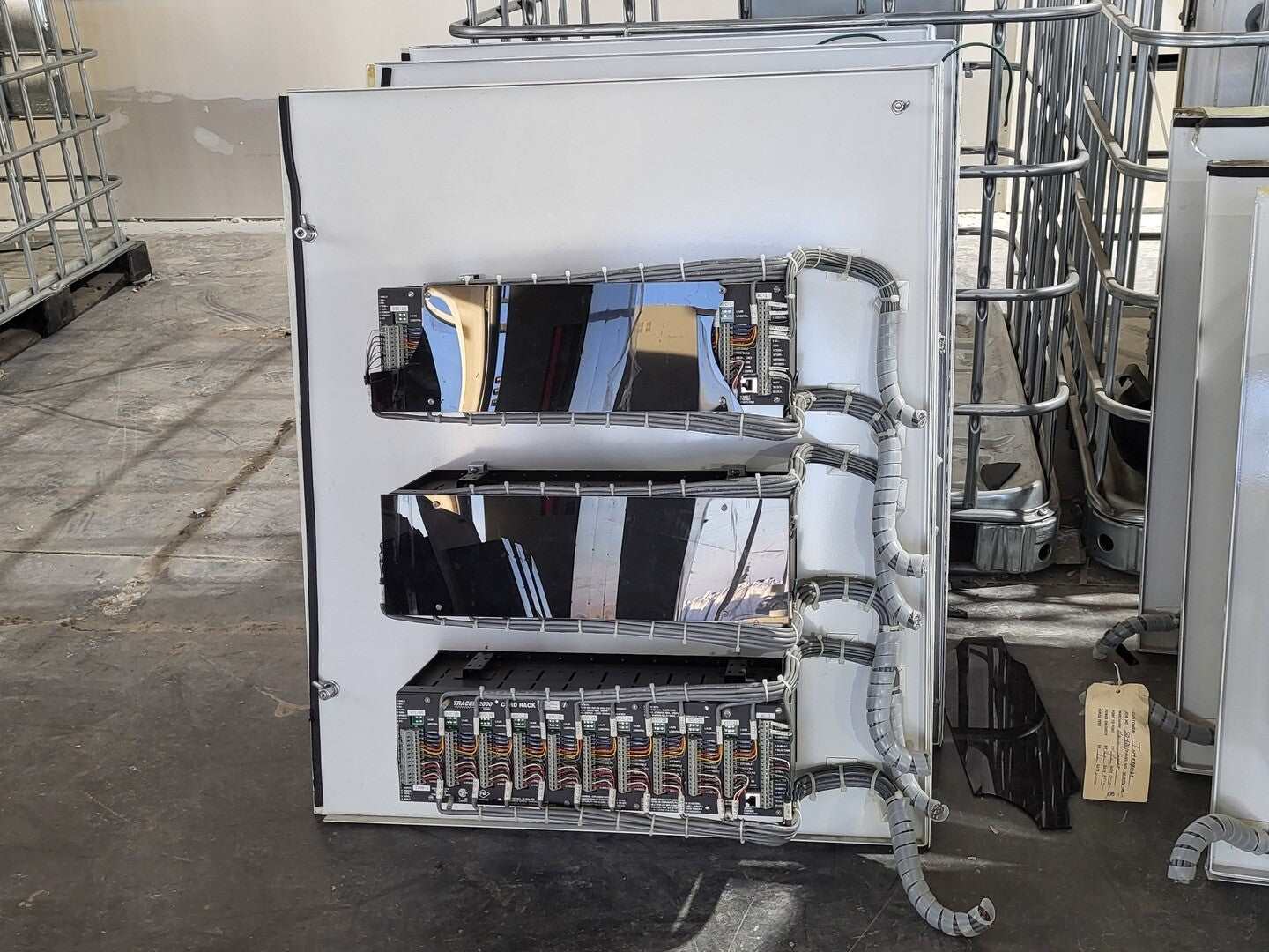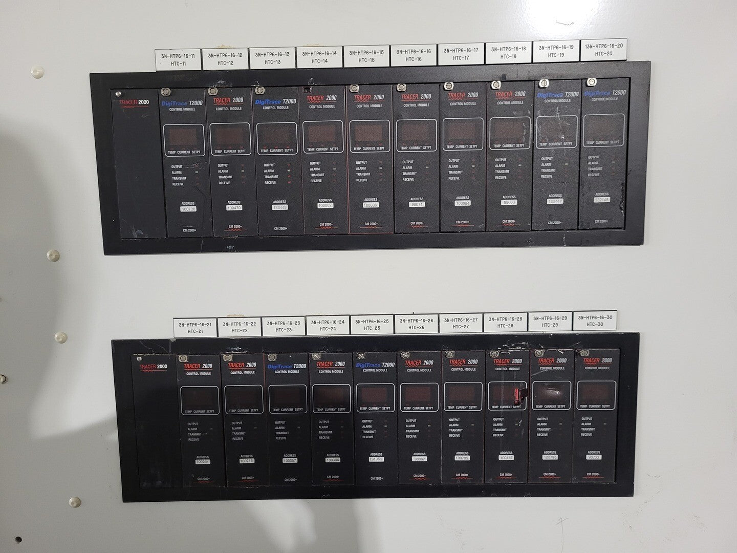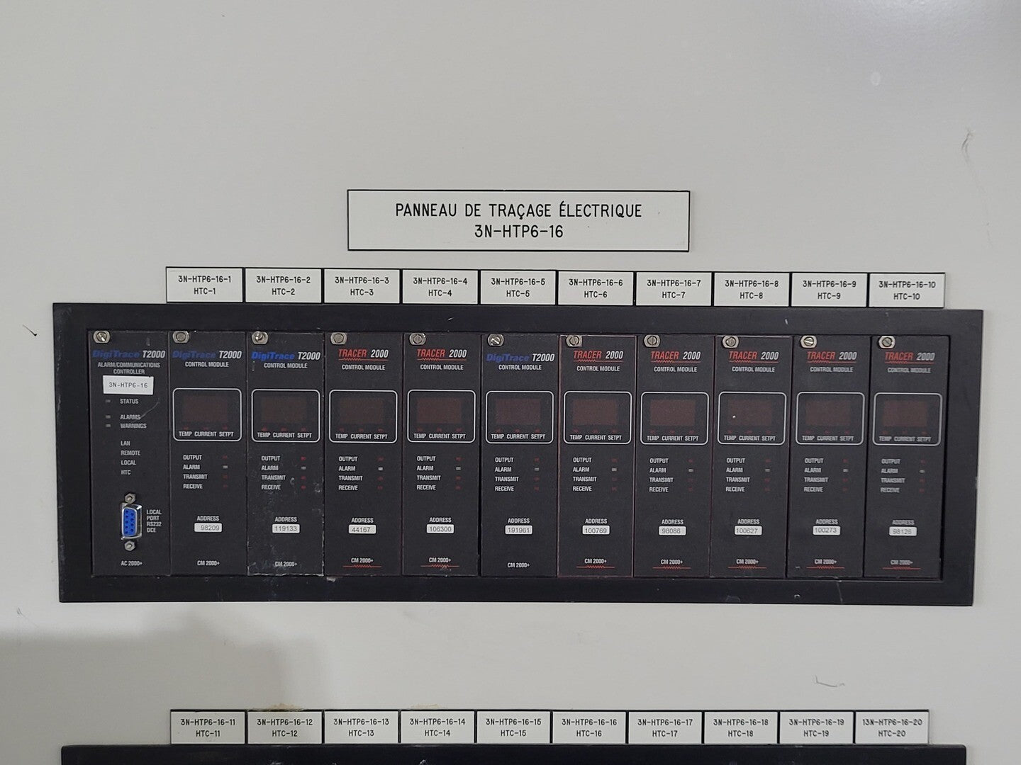 Heat trace controller panel with 30 control modules and 1 alarm/communications. CM 2000+ Module Specifications Operating Ambient: -40F to 149F Control Output: 12 VDC nominal, 50 mA max. Sensor Inputs: Two 3-wire 100 ohm platinum RTDs Power Requirements: 120 to 240 VAC nominal, 1-Phase, 5 W max. Temperature Measurement Range: