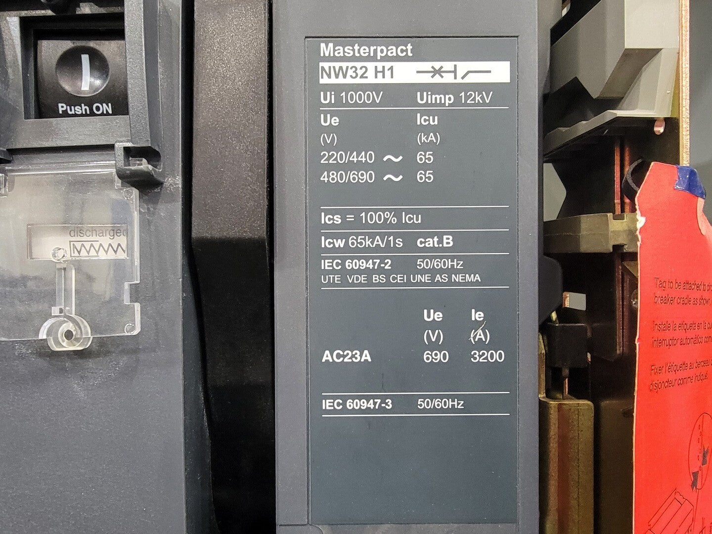 Schneider Electric / Square D Masterpact NW32 H1 (Draw-Out ACB)Type: Low-Voltage Air Circuit Breaker (ACB) - Draw-out Application: Main or feeder protection in LV switchgear Electrical Ratings Rated current: 3200 A Rated operational voltage: Up to 690 VAC Rated insulation voltage (Ui): 1000 V Impulse withstand (Uimp): 12 kV Interrupting capacity (Icu): 65 kA Service breaking capacity (Ics): 100% of Icu Short-time withstand (Icw): 65 kA for 1 s Short-circuit making capacity (Icm): 143 kA Utilization category: AC-23A Selectivity category: B Mechanical / Construction