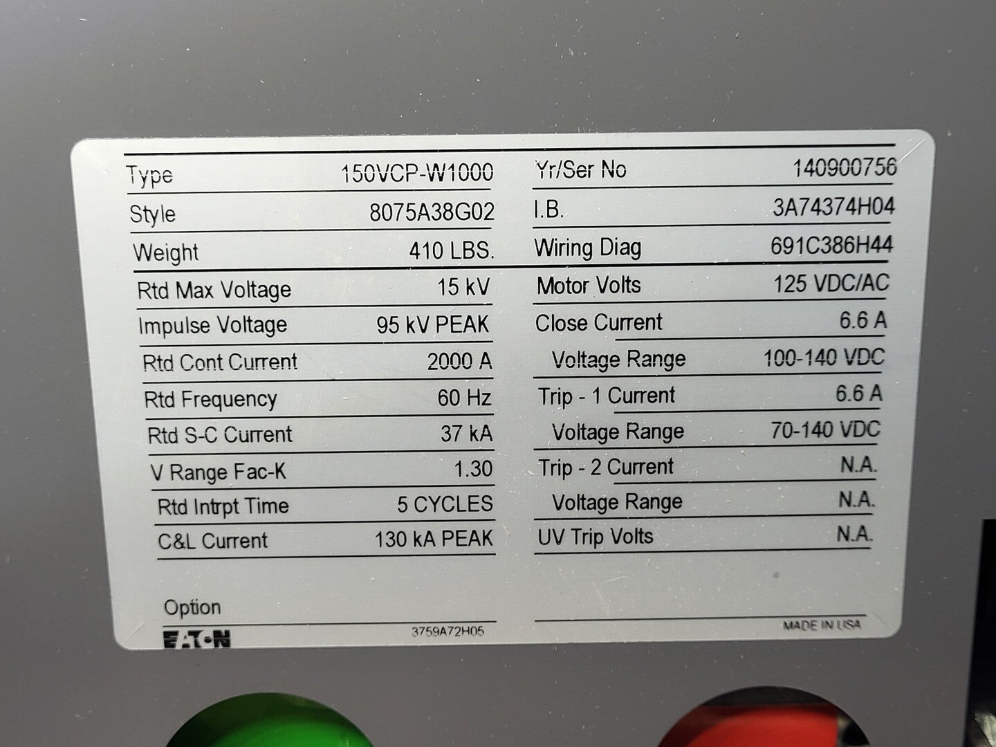 Style: 8075A38G02 Rtd max voltage: 15 kV Impulse voltage: 95 kV peak Rtd cont current: 2000 amps Rtd frequency: 60 Hz Rtd S-C current: 37 kA V range Fac-K: 1.30 Rtd intrpt time: 5 cycles C&L current: 130 kA peak Motor volts: 125 VDC/AC Close current: 6.6 amps Voltage range: 100 - 140 VDC |