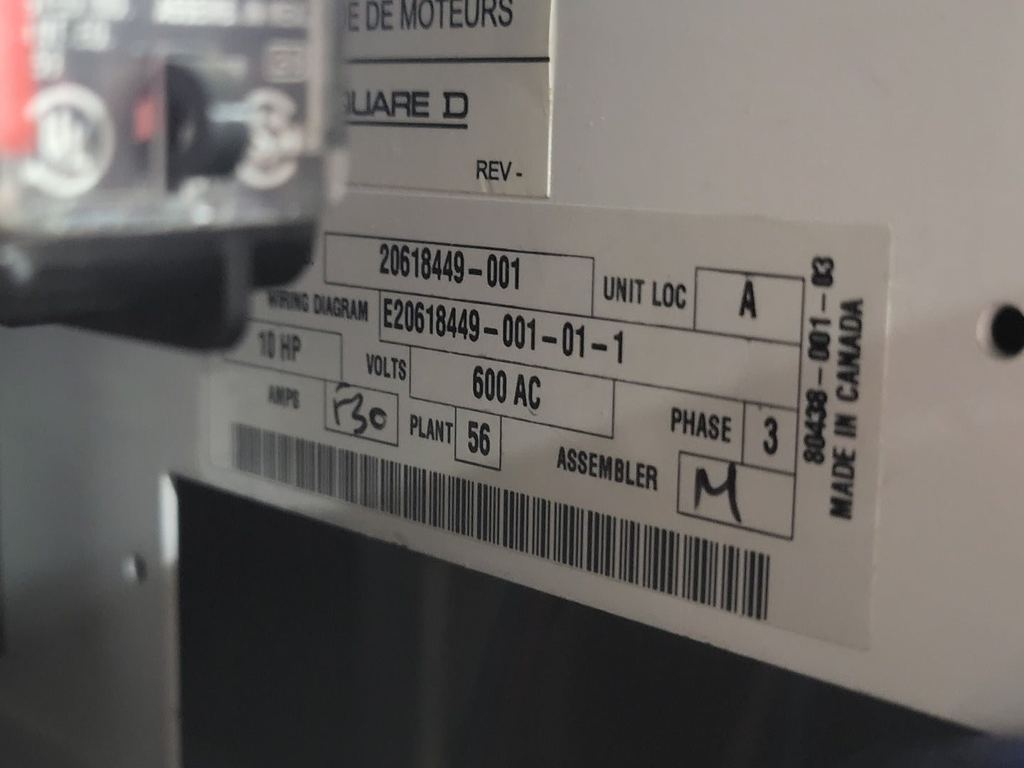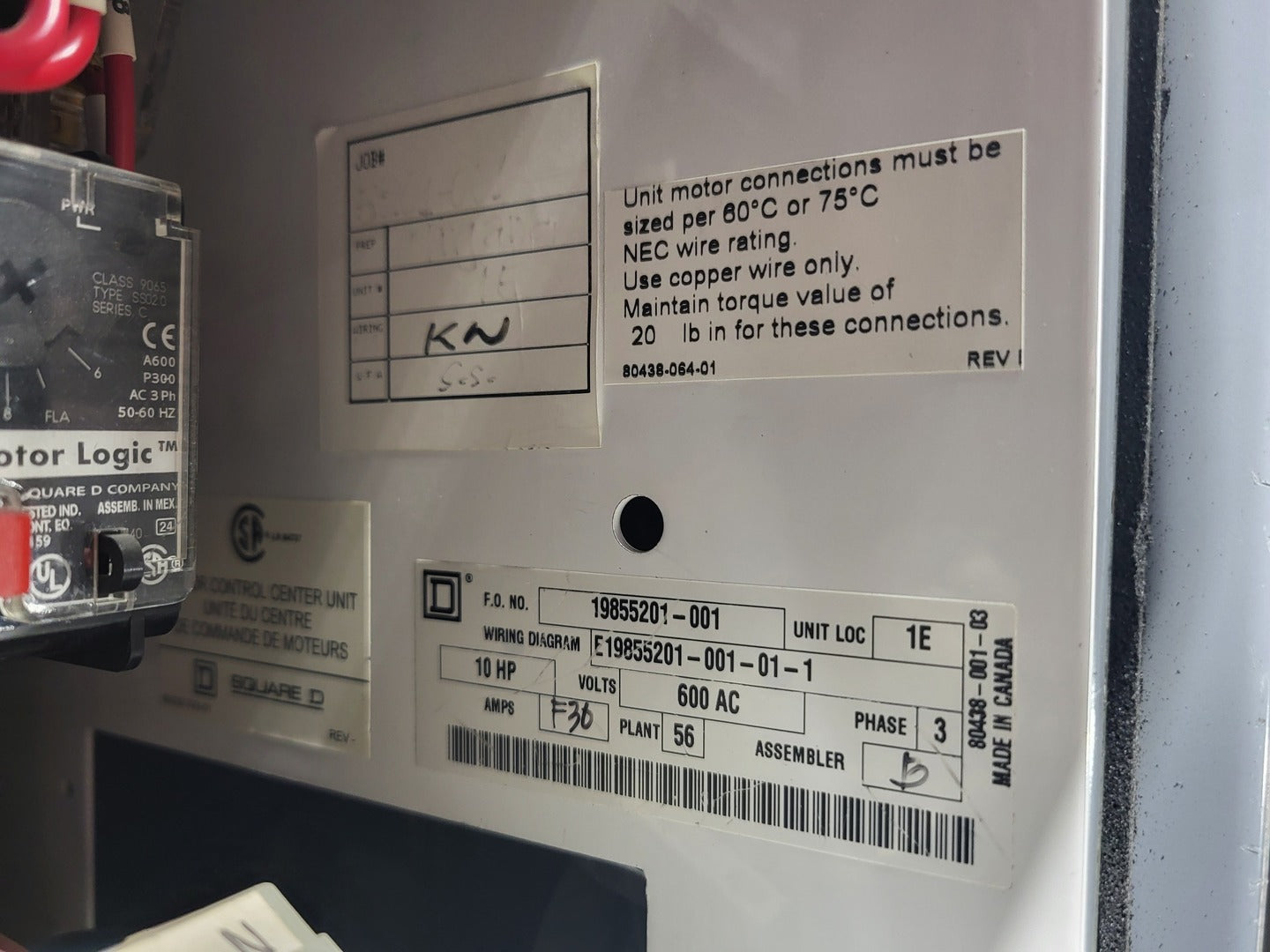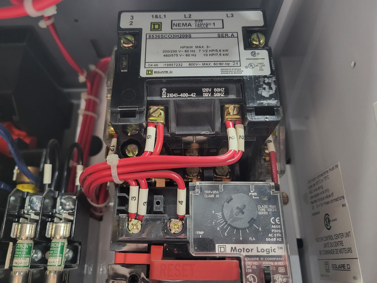 Disconnect 1 x 60 amps, 600 volts, 3 phase disconnect Motor Starter #1 #2 #3 3 x NEMA Size 1 Contactor Square D 8536SCO3H209S Rated up to 10 HP @ 460/575V Motor Starter #3 #4 2 x NEMA Size 1 Contactor Square D 8536SCO3H200S Rated up to 10 HP @ 460/575V Motor Protection #1 Square D Motor Logic Type SF020 Motor Protection #2 #3 2 x Square D Motor Logic Type SS020 Motor Protection #4 #5 2 x Square D Motor Logic Type SSC20 Control Transformer 5 x Square D 9070EL2D5 0.07 kVA control power transformer |