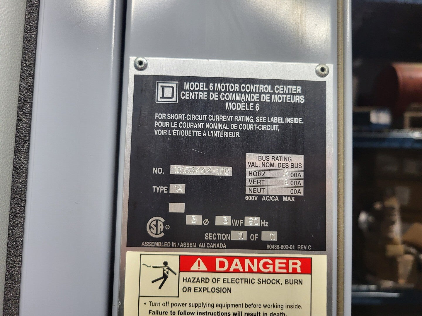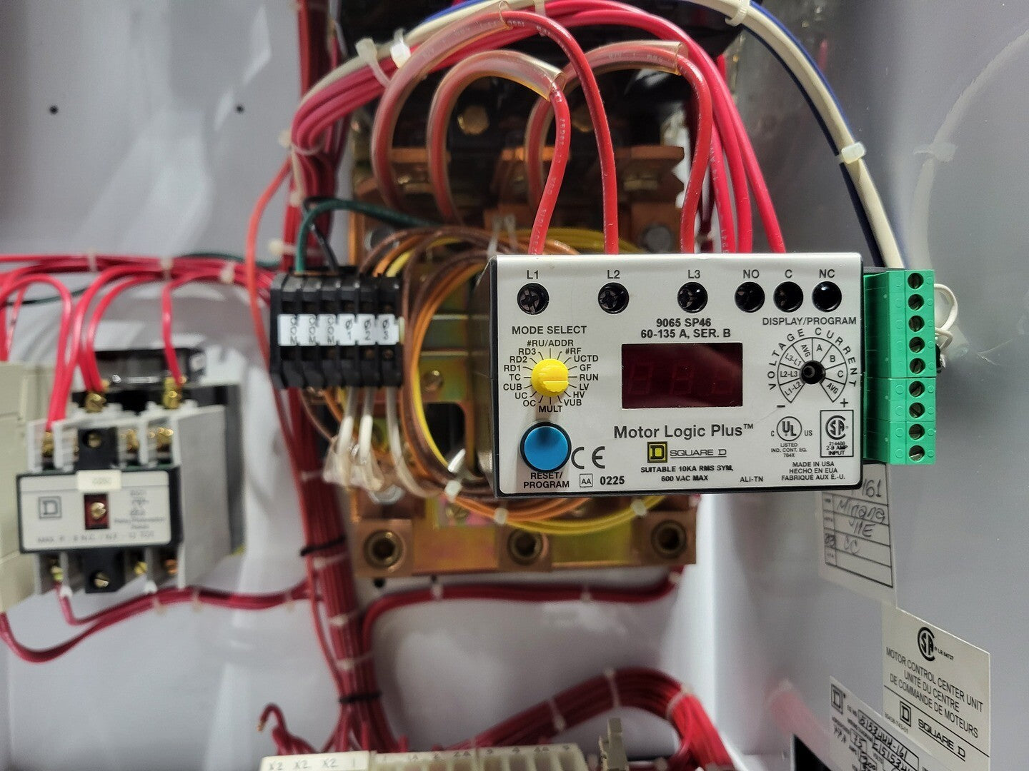 Square D Model 6 motor control center section rated for 600V, 3-phase power distribution. This MCC column includes multiple motor starter buckets with Motor Logic Plus protection modules, fused disconnects, control transformer, and Schneider Electric communication components. Ideal for industrial motor control systems, pump stations, processing plants, and heavy industrial electrical distribution.