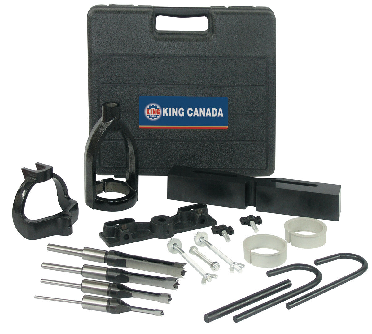 - Kit comes with chisel holder, holddown arms, holddown bracket, fence, ring bushing adaptors, 4 pc. 1/2" shank mortising chisels and bits and carrying case